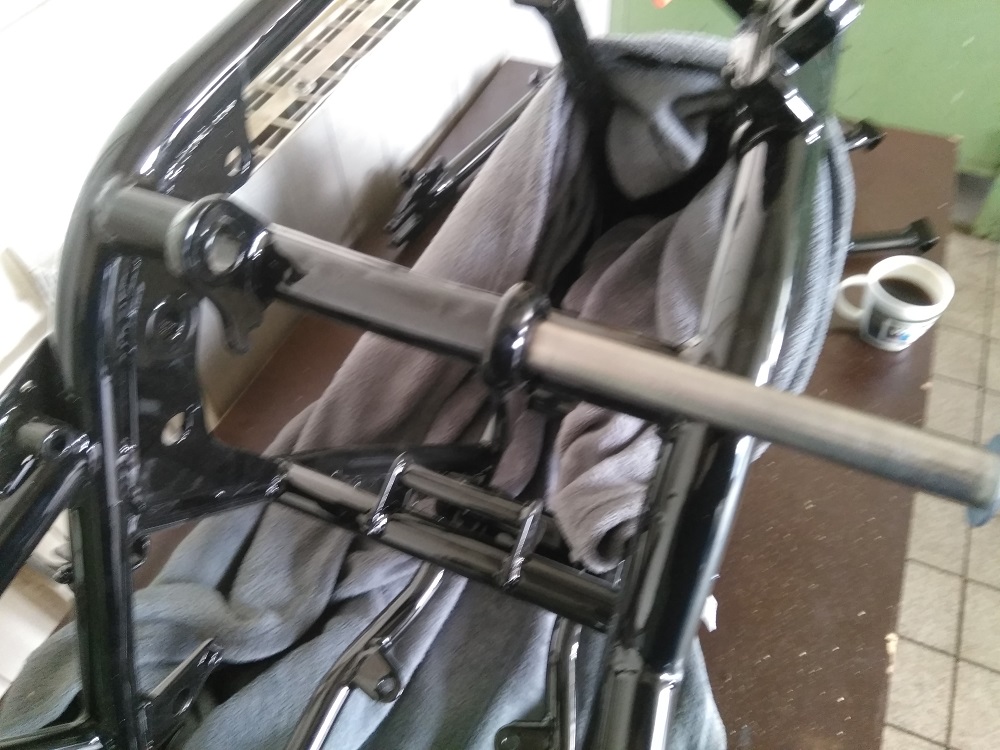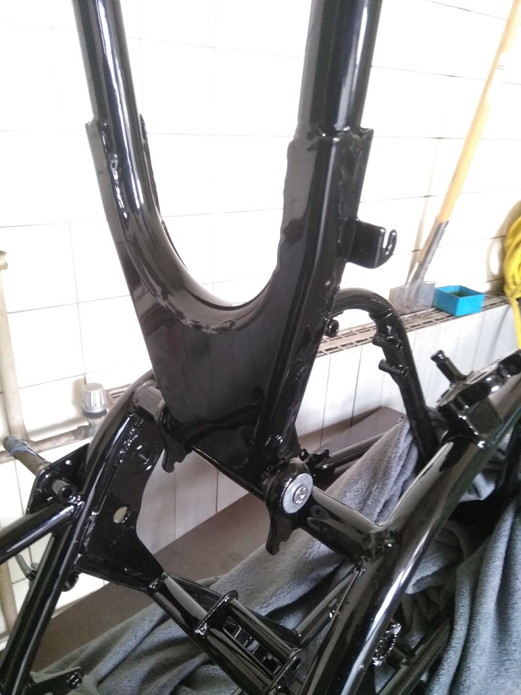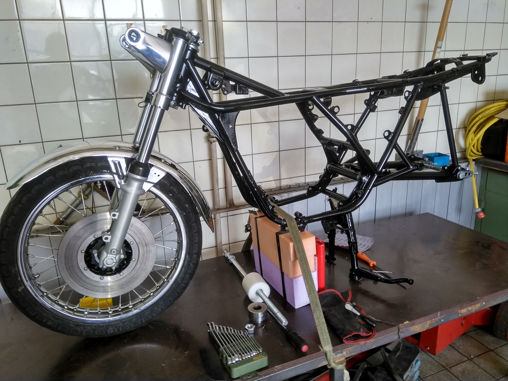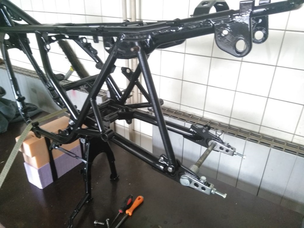 So es geht langsam weiter mit dem Triple. Der Rahmen ist jetzt „Aufgespannt“ und Probehalber war die Schwinge schon mal an ihren Platz. Sie musste aber noch mal ein wenig Bearbeitet werden. Die Gewinde und Achsaufnahme mussten noch von Pulver befreit werden und die Kettenspanner gereinigt und leicht überarbeitet werden. Jetzt liebt das gute Stück bereit um endgültig wieder seinen Platz einnehmen zu können. Das wird noch etwas heikel da es auch hier auch Eng zugeht. Die Pulverbeschichtung baut nun mal ein wenig mehr auf als Lack.