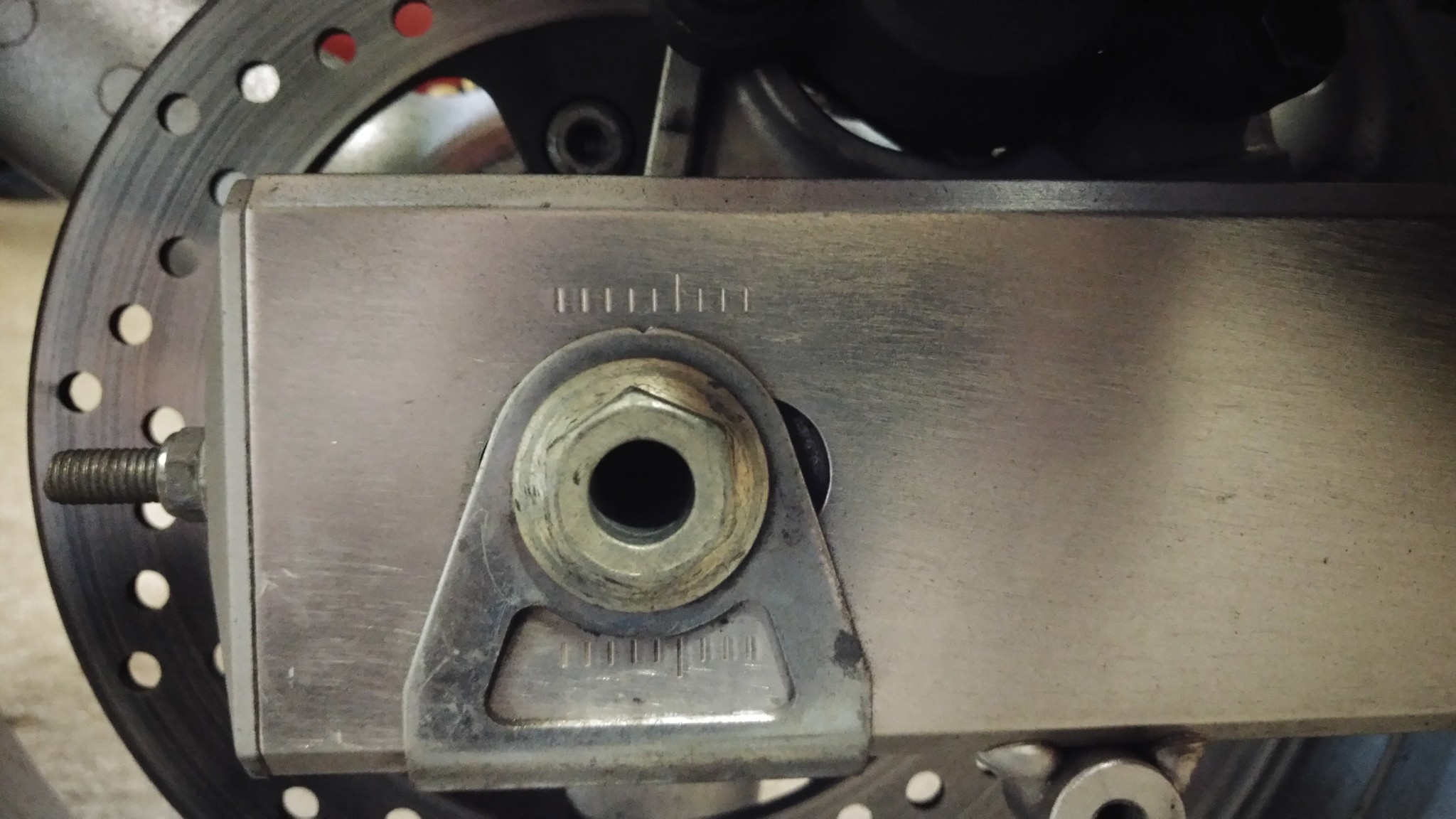 Habe sie also in der Mitte mal angehoben im unbelasteten Zustand und mit einem Zollstock gemessen. Kam auf 3 cm bei der Unterseite der Kette gemessen. Es ist ein anderes Federbein verbaut von einer ZX10 und folgenden Bilder machten mich auch stutzig da dies ja nicht genau gleich ist auf beiden Seiten.