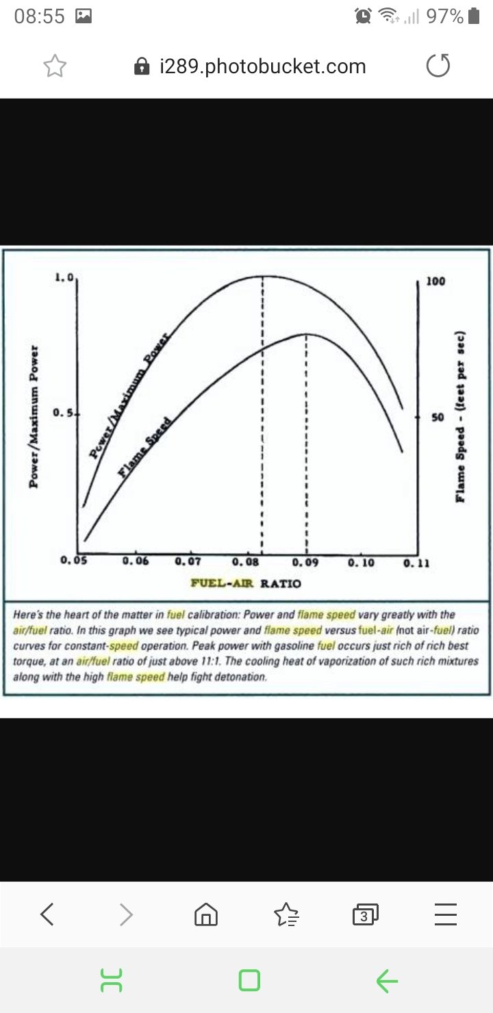Sicher schwanken die Werte leicht zwischen Motoren, aber eben nur leicht. Als Richtwert kann man AFR 12,5 für Beschleunigung und Drehmoment und 13,2 für Leistung nehmen. Die höchste Leistung findet aber nicht beim höchsten Verbrennungsdruck statt sondern das höchste Drehmoment. Die höchste Leistung tritt ein wenn das Drehmoment schon wieder etwas nachlässt.
