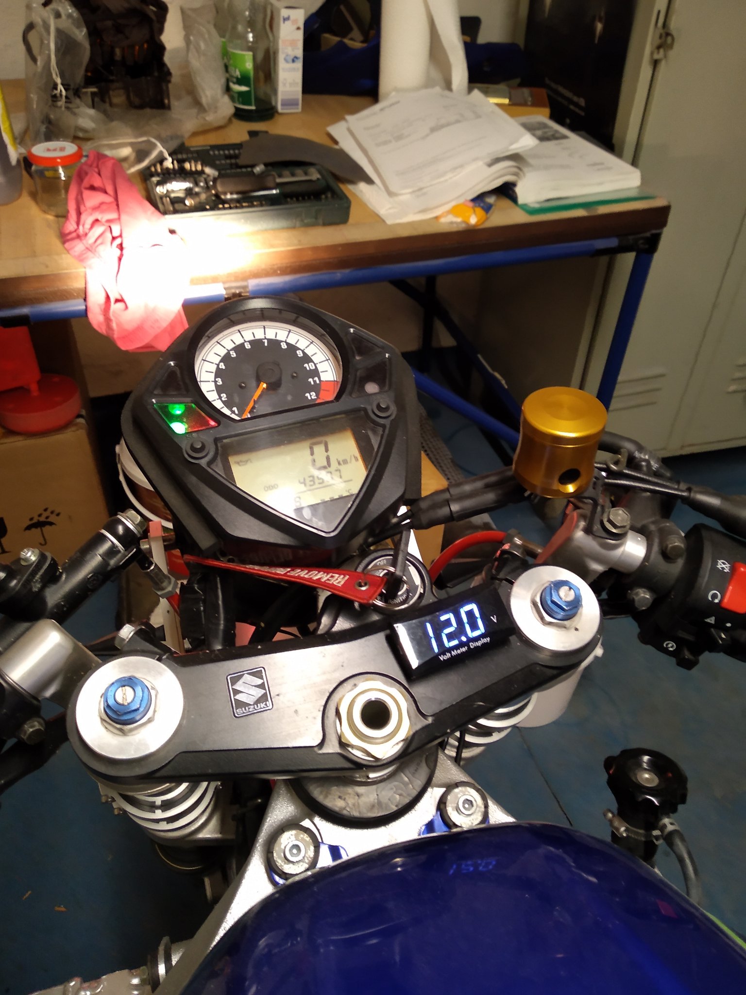 Beim Fahren habe ich gesehen, wie die Bordspannung immer weiter sinkt... Als ich zu Hause war wollte ich die Sache natürlich sofort überprüfen. Also Öl raus, Deckel runter... In meiner Hektik habe ich das Gewinde der Ölablassschraube ruiniert. Das hat mir völlig den Elan genommen weiter zu machen und ich hatte auch noch ein paar andere Dinge zu tun sowie noch ein fahrtüchtiges Bike in der Garage....