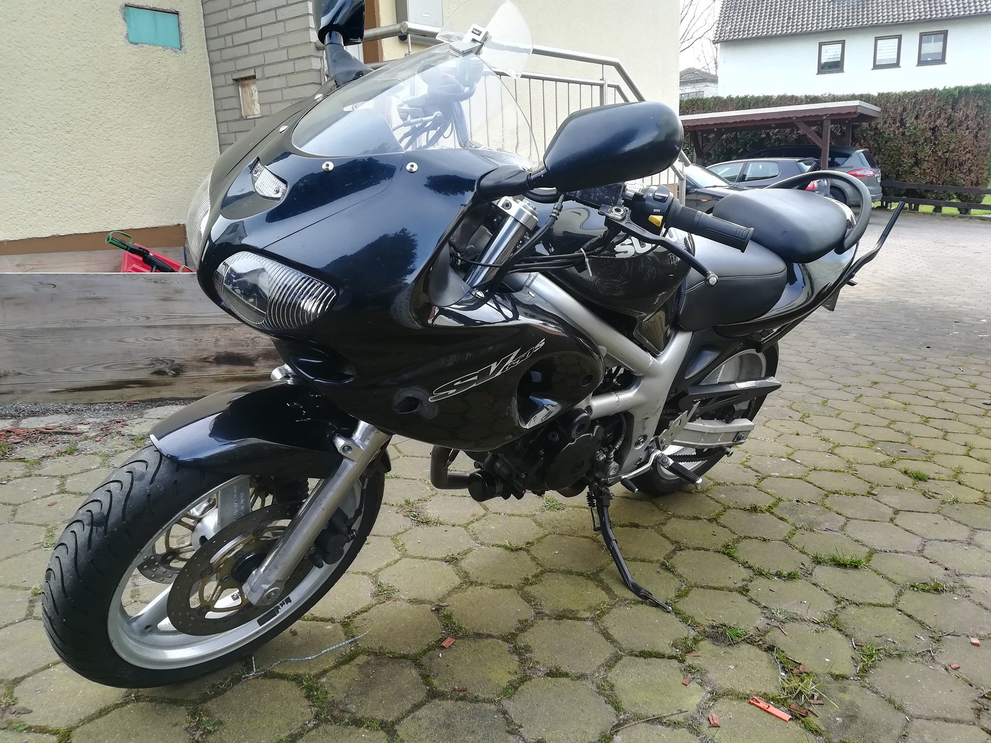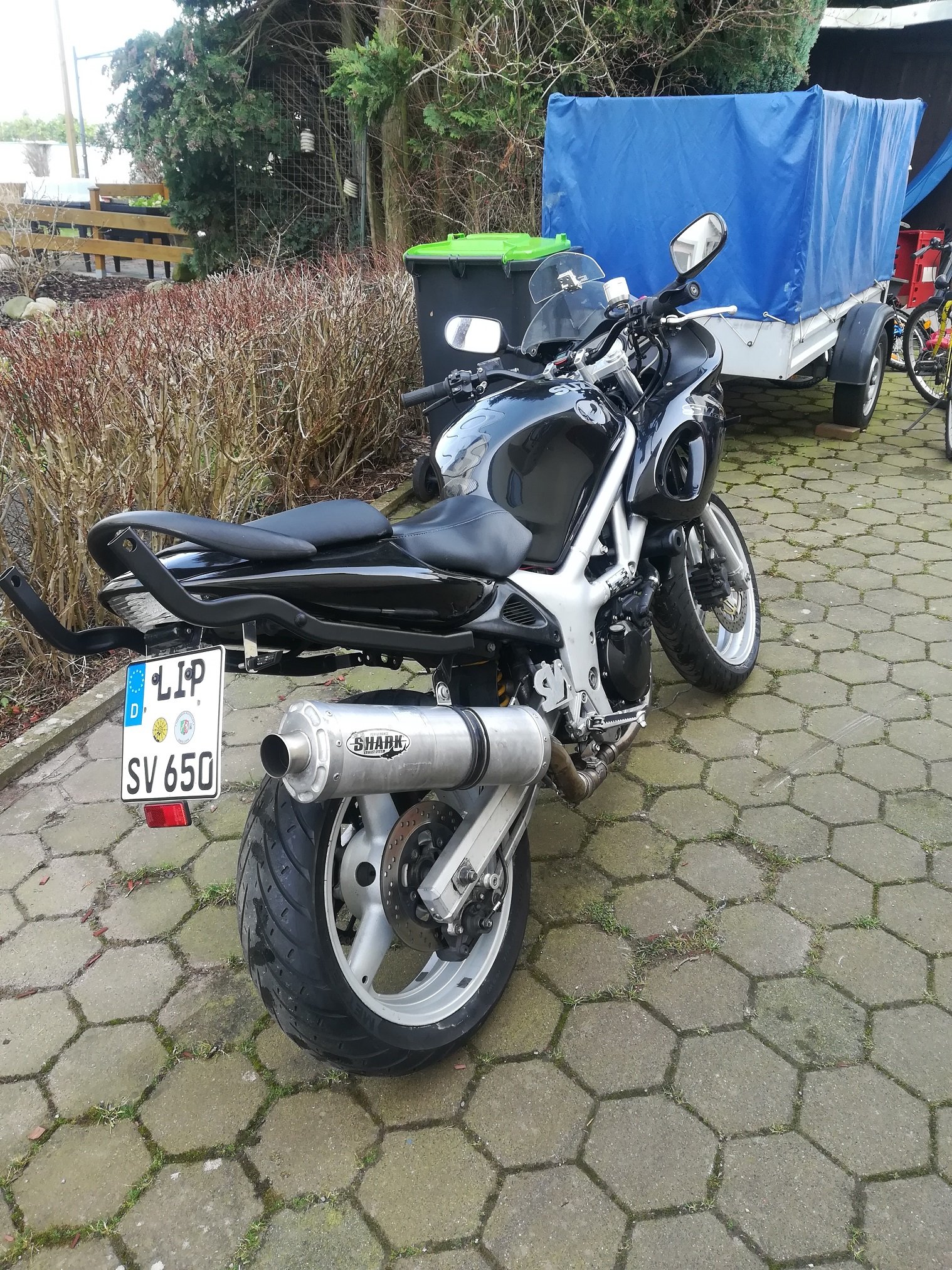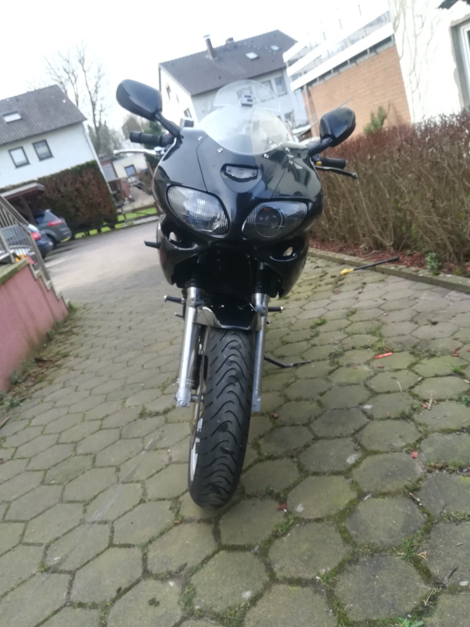 Der Motor ist getauscht, Vergasersynchronisation überprüft, Zündkerzen, -stecker, -kabel und Luftfilter sind getauscht, eine neuer Tank hat Einzug gehalten, Eine Freundin hat mir die gebrochene Verkleidung geschweißt und mit Drahtgitter verstärkt, die Elektrik ist verlegt, die Spannungsanzeige verbaut, die neuen Reifen aufgezogen (ich musste nicht mal Gewicht ankleben) und Winkelventile eingebaut, die Shark Komplettanlage inkl. selbst gebautem Halter angebaut und die VVK ist zur Probe nur dran gesteckt. Deren Halter lackiere ich gerade schwarz. Evtl kommen auch die Soziusrasten wieder dran.