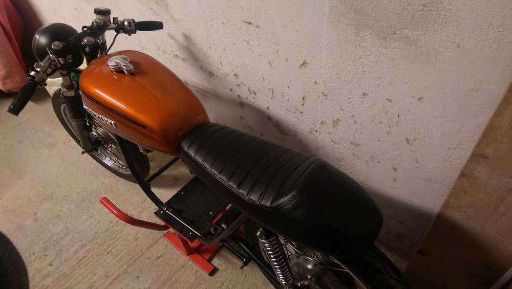 Geplant war noch ein Umbau auf einem formschönen GS 550 T Tank und Sitzbank. Da ich aber seinerzeit keinen Tank bekommen hatte, musste der org. Tank herhalten. Der GS 550 T Tank war auch der einzige Tank, der mit dem Wasserausgleichsbehälter unter dem Tank passte. Internet gab es damals ja noch nicht, alles wurde aus Zeitschriften zusammengesucht.
