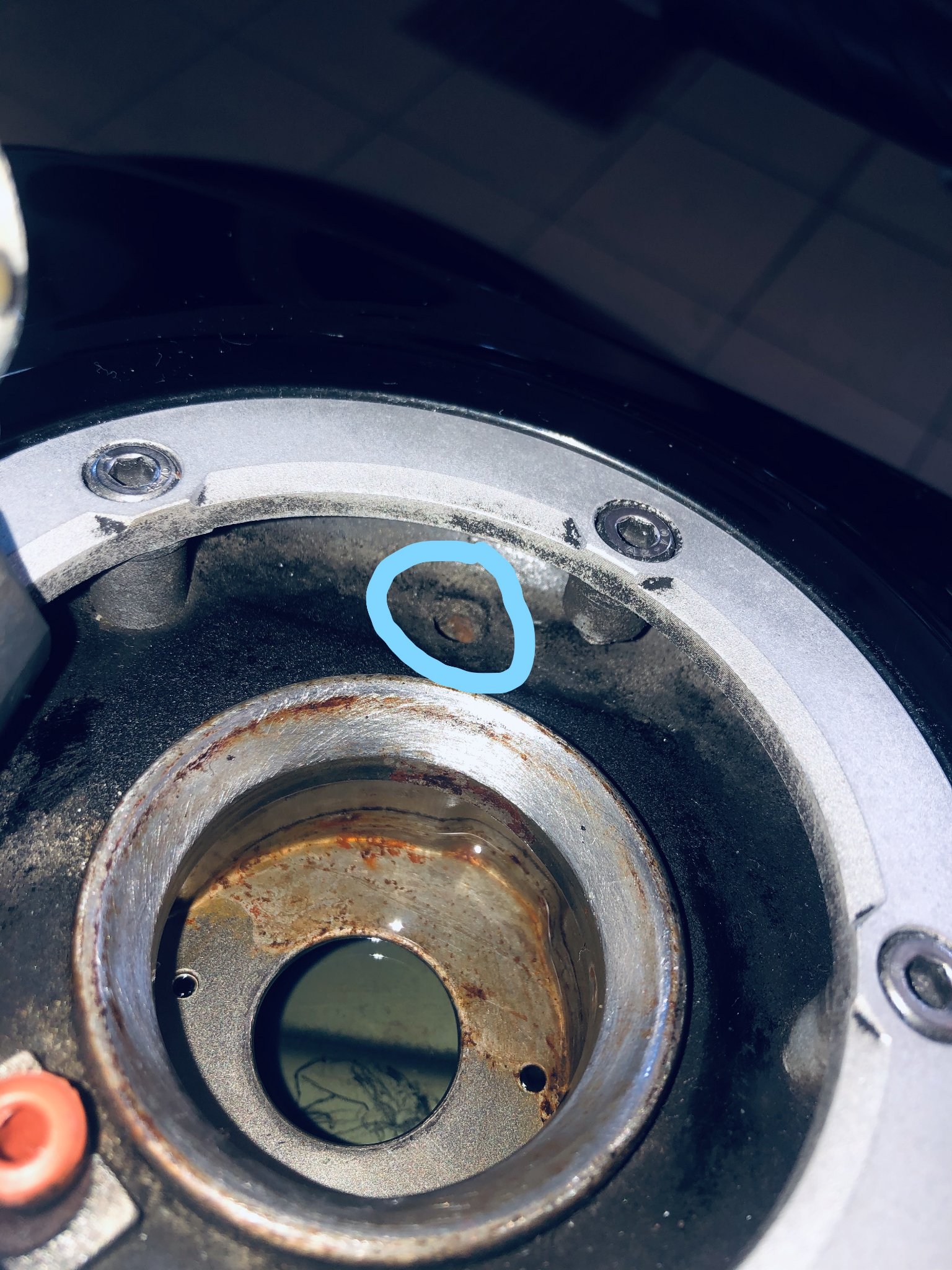 Bei meiner SV650 K7 ist mir beim Einwintern eine weiße Ablagerung im inneren des Tankdeckels aufgefallen. Daher habe ich das Tankschloss abgebaut und während der Demontage natürlich den Tank abgedeckt, damit mir nichts reinfällt. Anscheinend hab ich aber ein kleines Kügelchen übersehen und als ich den Tankdeckel wieder schließen wollte, fiel mir diese Kugel in das unten gekennzeichnete Loch. :roll: