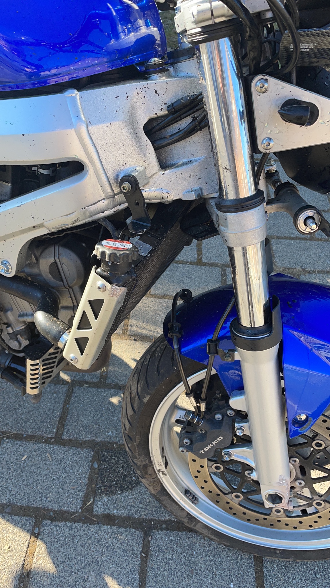 Bin dann über einen Bordstein (ca. 15cm) und in einem 25 grad Winkel zu einem Gartenzaun entlang. Dieser hatte Steinpfosten wo ich entlang bin (meines Wissens nicht frontal eingeschlagen), davon sieht man Spuren am rechten Standrohr im Bereich der Klemmung der Achse.