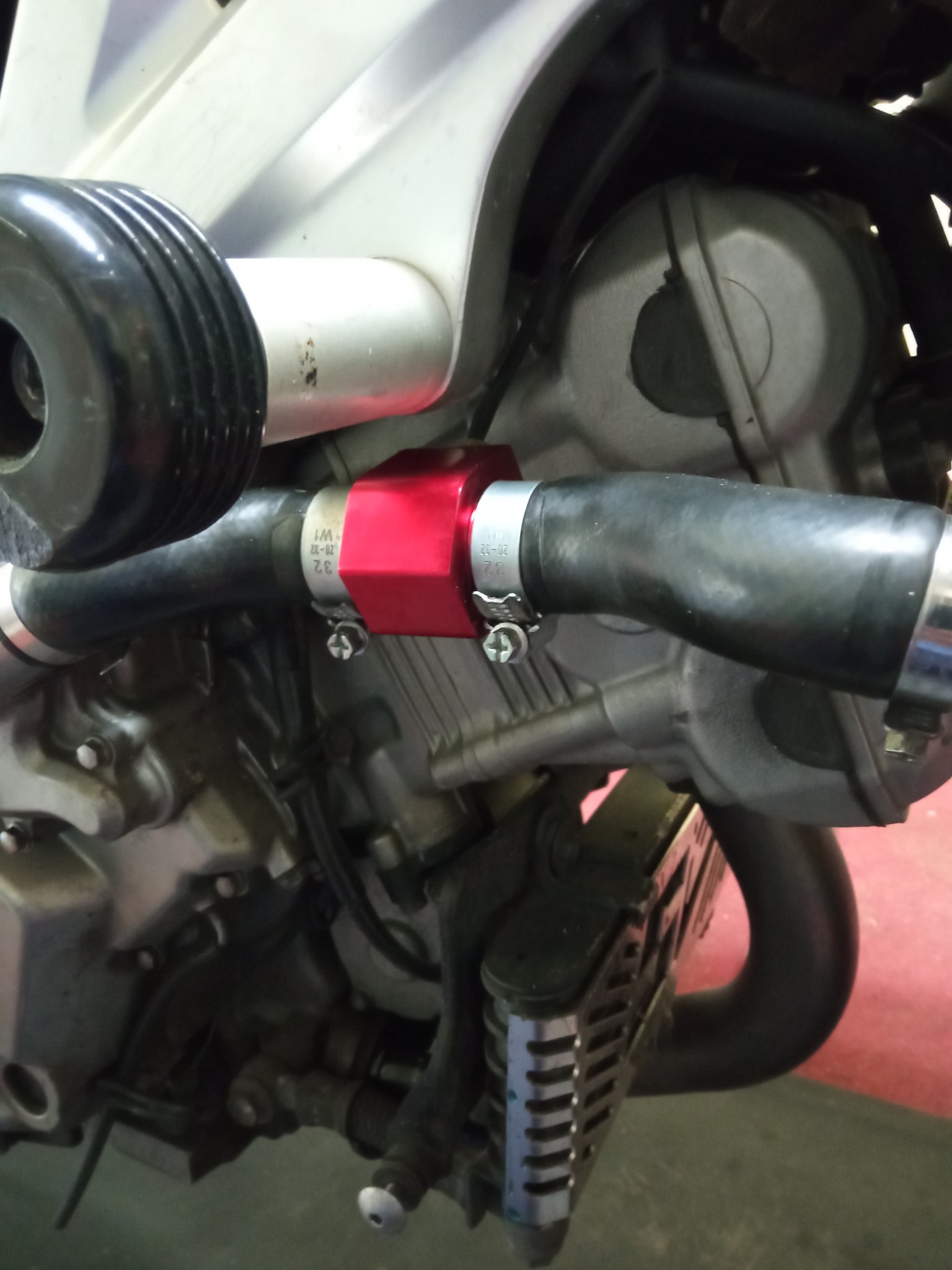 Deshalb habe ich heute etwas anderes fertig gemacht. Die Kühlwasser-Temperaturanzeige. Ein Koso Mini 3 zeigt nun wahlweise Spannung, Wassertemperatur oder Uhrzeit an. Die Wassertemperatur wird an einem Schlauch im großen Kreislauf abgenommen. Das ist das einfachste. Dafür habe ich mir ein Sensorgehäuse mit 26mm Durchmesser bestellt. Das beim Koso mitgelieferte hat nur 22mm . So sehr wollte ich den Querschnitt nicht verjüngen.