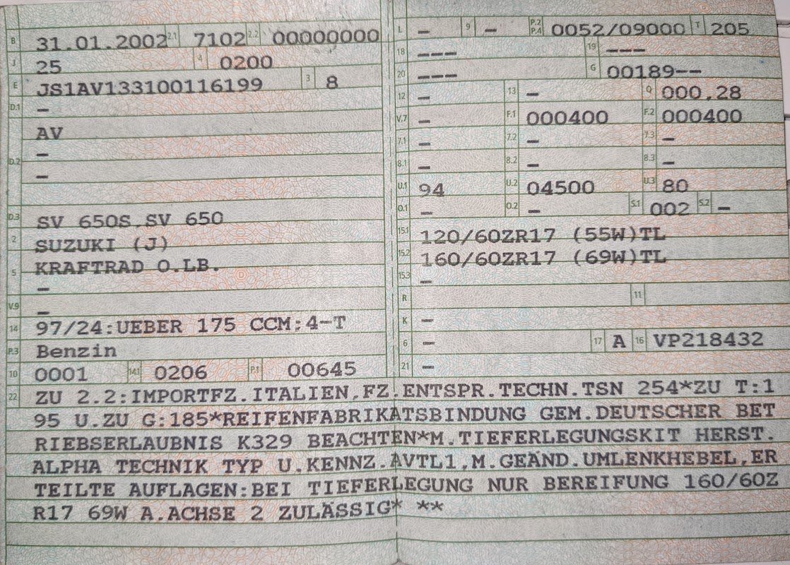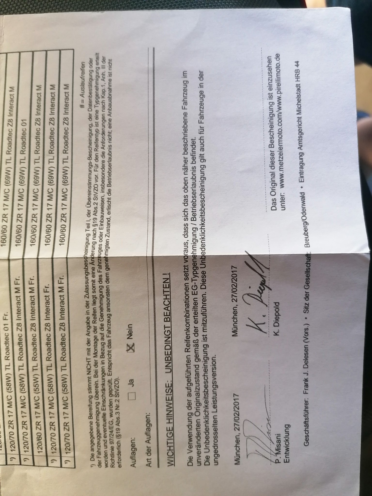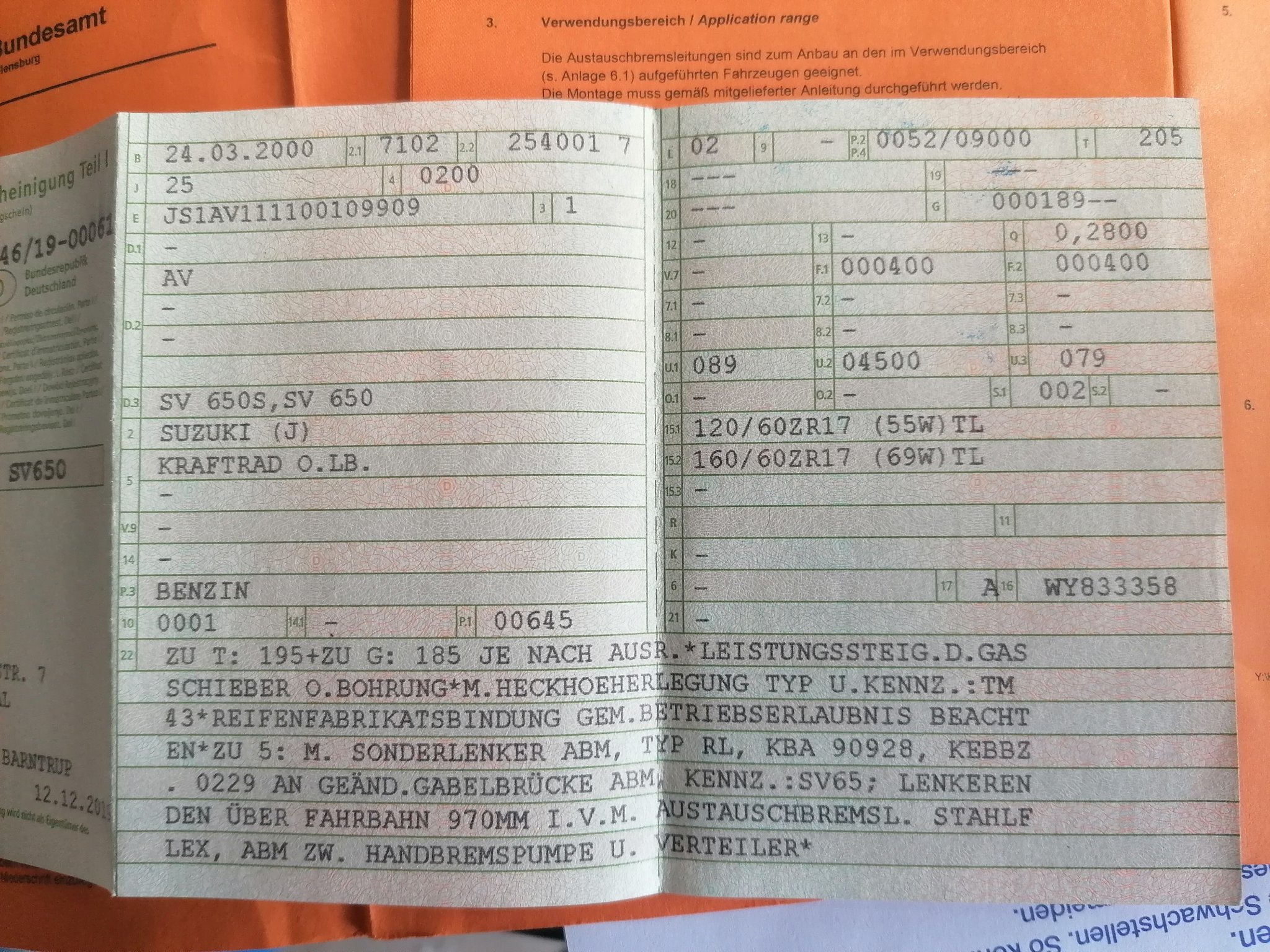 Meine SV kommt aus Italien, dürfte also unter "Einzelabnahme nach §20/21" fallen. Am liebsten wäre es mir, wenn ich keine Fabrikatsbindung und 60er + 70er Vorderreifen eingetragen hätte.