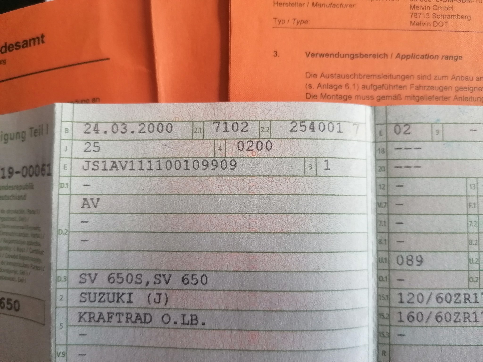 Umgebaut und eingetragen sind SBL Umbau und eine Höherlegung. Beim SBL war nur die Stahlflex bis zum Verteiler dabei, daher hat der Vorbesitzer den unteren Teil und hinten mit Flex von Melvin ergänzt. Seine nachvollziehbare Aussage war, dass die ABE der Melvin nicht mehr gilt, weil sie die serienmäßige Fahrzeuge gilt und es auch eingetragen werden müsste. Soweit war mir das auch klar, aber ich habs drauf ankommen lassen.