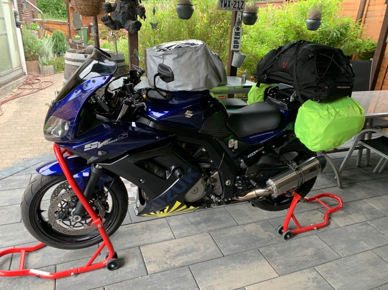 Hab dann doch den großen Tankrucksack gegen einen 5 Liter getauscht, Regenjacke passte dort rein und die Hose ins Heck.