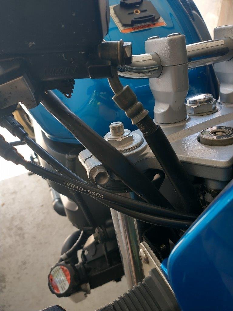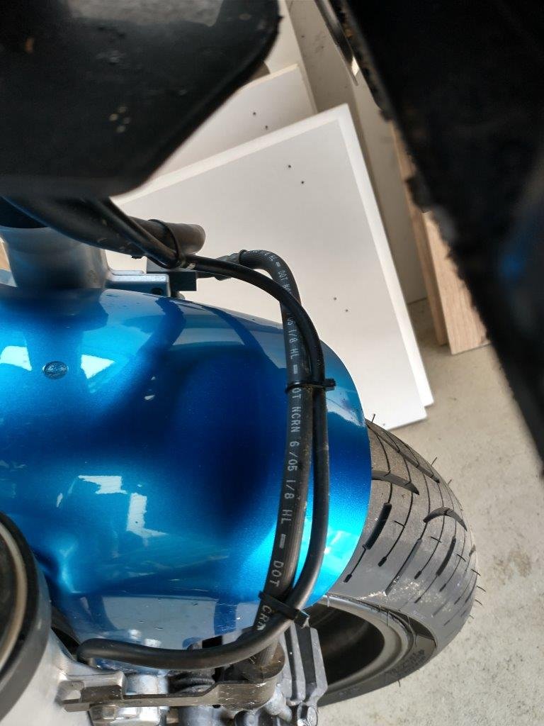 Zur Befestigung der vorderen Leitungen habe ich dann die für hinten beigelegten Klemmen einfach an den originalen Befestigungspunkten von vorne benutzt. Ich habe die lange Schraube vom Verteiler allerdings an der Gabel genutzt um zwei Klemmen anzubringen und die kurze der Gabel dann an der rechten Seite benutzt. Davon kann ich bei Bedarf noch Bilder nachreichen. Anschließend noch alles was lose ist etwas mit Kabelbinder festgemacht und kontrolliert, ob Lenkeinschlag usw. in Ordnung ist und nichts scheuert. Das passt soweit, allerdings könnte die hintere Leitung locker ein paar cm kürzer sein und auch die für vorne könnten etwas kürzer sein. Wer eine Lenkererhöhung hat oder einen breiteren Lenker sollte damit also keine Probleme haben, bei mir verlaufen die Leitungen in etwas größerem Bogen, das ist jetzt nicht superelegant, aber auch nicht weiter störend. Die Bremse funktioniert, vorne wie hinten und ich spüre vor allem hinten doch einen großen Unterschied, auch vorne ist nun deutlich knackiger, was natürlich auch alleine schon am Wechsel der alten Leitungen liegen kann.