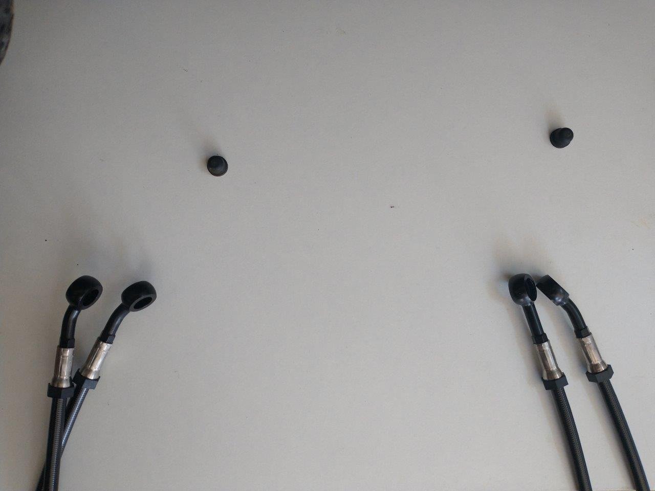 Es gehen dann also zwei Leitungen direkt vom Behälter zu den Bremssätteln. Bei den Anschlüsse ist es so, dass eine Leitung etwas kürzer ist und einen geraden und einen gekröpften Anschluss hat.
