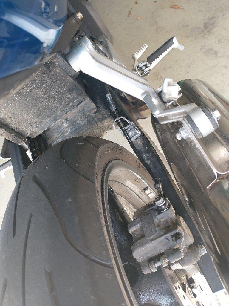 Dann habe ich das selbe beim Hinterrad wiederholt, hierzu muss die Seitenabdeckung unterm Fahrersitz abgeschraubt werden, der Bremsflüssigkeitsbehälter abgeschraubt und etwas rausgezogen werden, sonst kommt man nicht an die Schrauben des Deckels. Da die Leitung kürzer ist und eigentlich nur am Bremssattel und der Bremspumpe befestigt ist, geht das Ganze recht flott und genauso wie vorne, was das Entlüften angeht. Hinten sah das dann so aus: