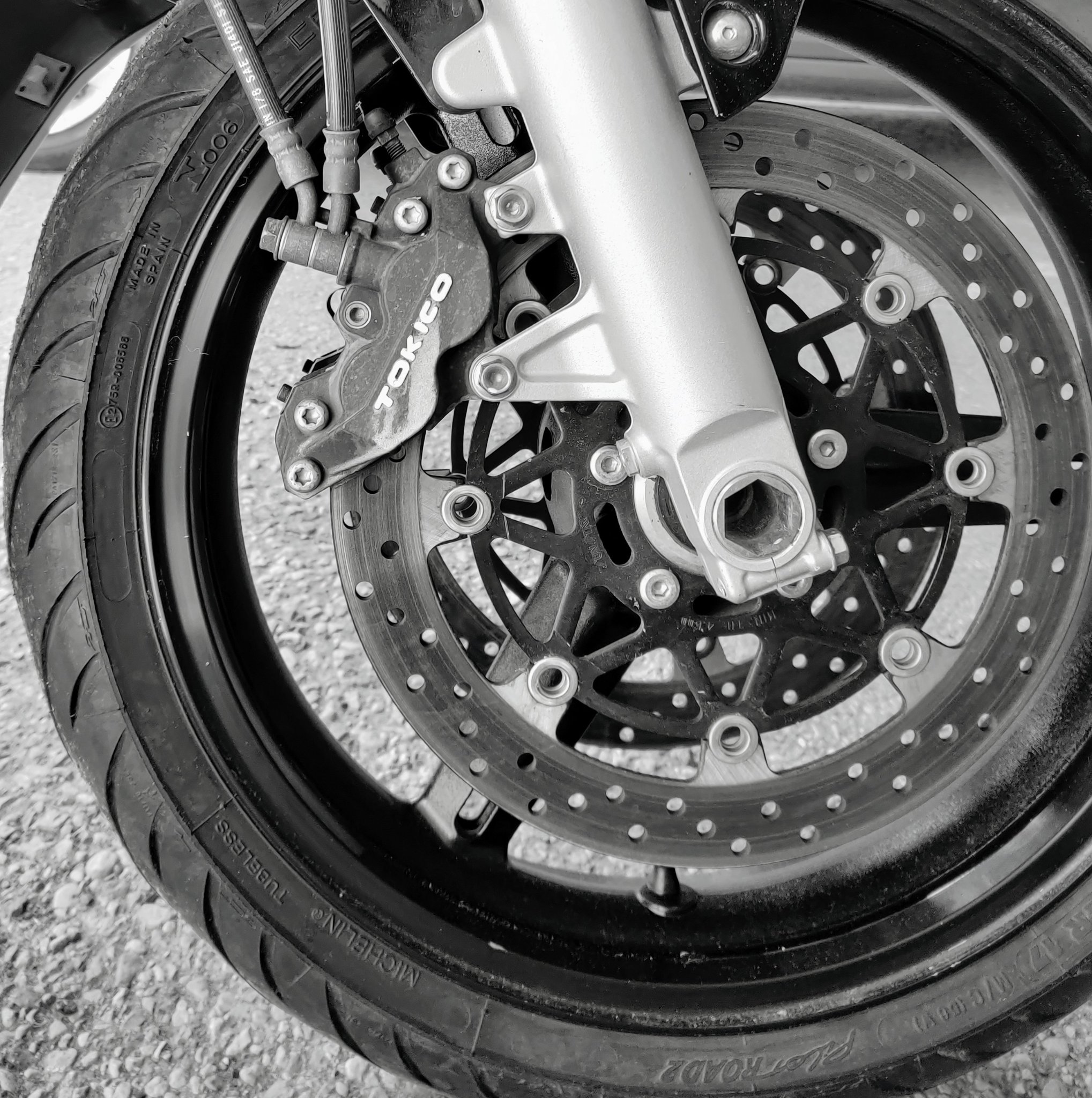 Heute die Schriftzüge auf den Bremsen erneuert (bis es mal was Neues gibt) und die Unterlegscheiben vom Tank 'vergoldet'