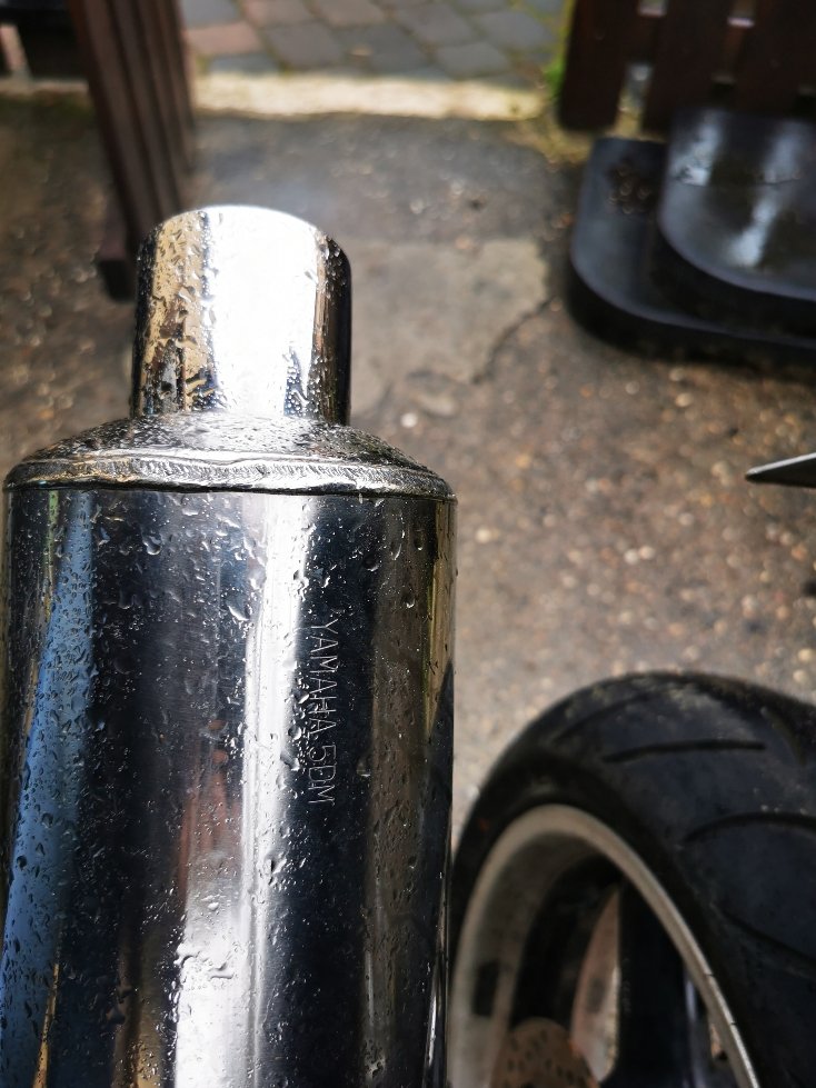 Da dabei der Auspuff zerstört wurde, hat einer der Beiden einen Auspuff einer Yamaha dran gebastelt, die Auspuffhalteschraube durch eine Gewindestange mit 2 Muttern ersetzt.