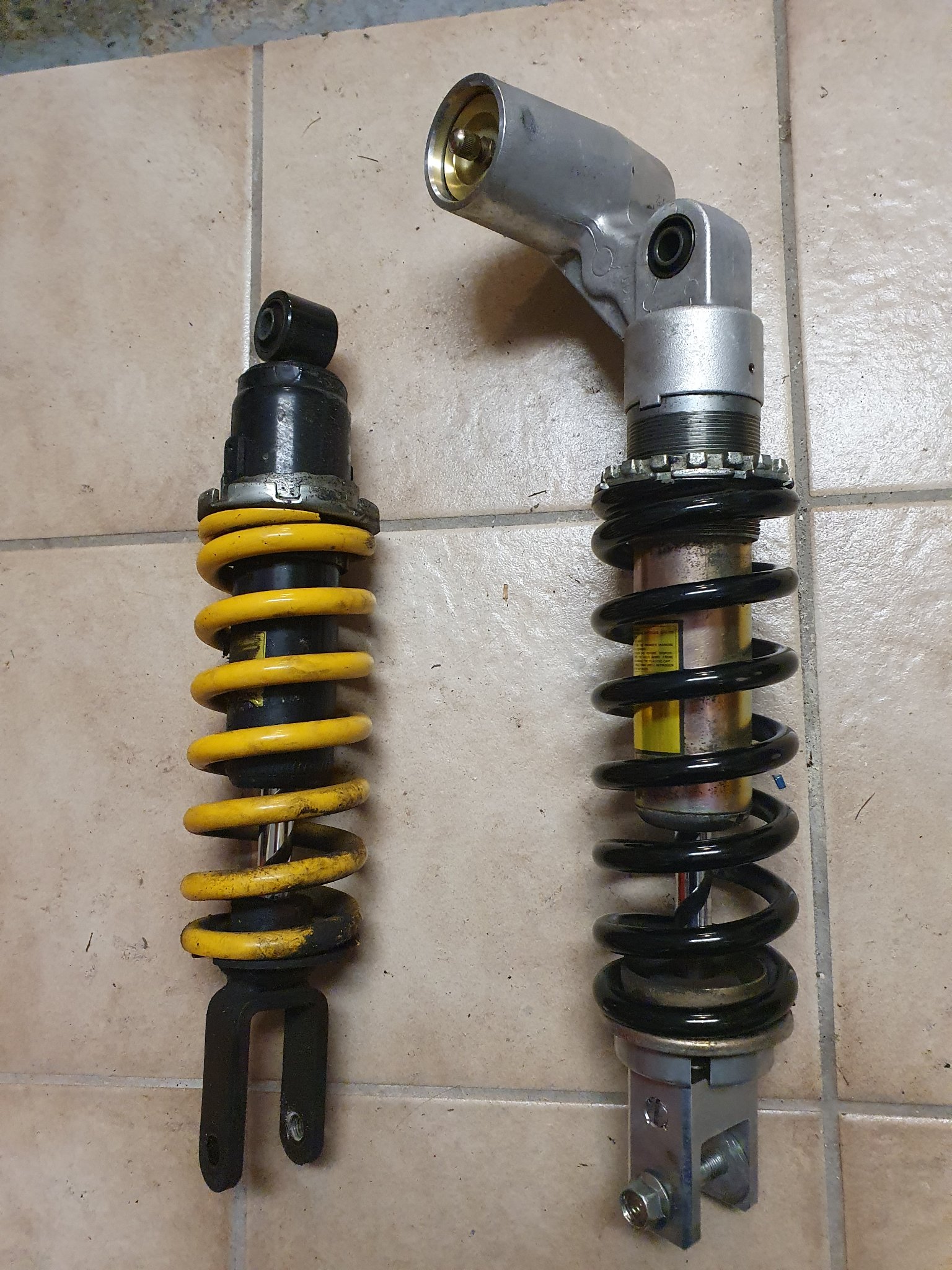 Hinten gabs den SRAD Umbau. Was soll ich sagen, ein neues Motorrad. Die Federrate ist für mein Gewicht von ca. 67kg perfekt, die Dämpfung kann nach Ermessen angepasst werden und das Ding ist im Vergleich zum Original sehr feinfühlig. Die MT09 (BJ2018) meines Kumpels arbeitet gefühlt nicht besser. Für den Umbau mussten, wie nach Anleitung, der Batteriekasten und die Tankaufnahme bearbeitet werden, dazu kam noch ne flachere Batterie. In voll ausgefedertem Zustand kommt die untere Federaufnahme des Federbeins bedrohlich nah an die Schwinge, aber 2 Blatt Papier haben da noch zwischen gepasst