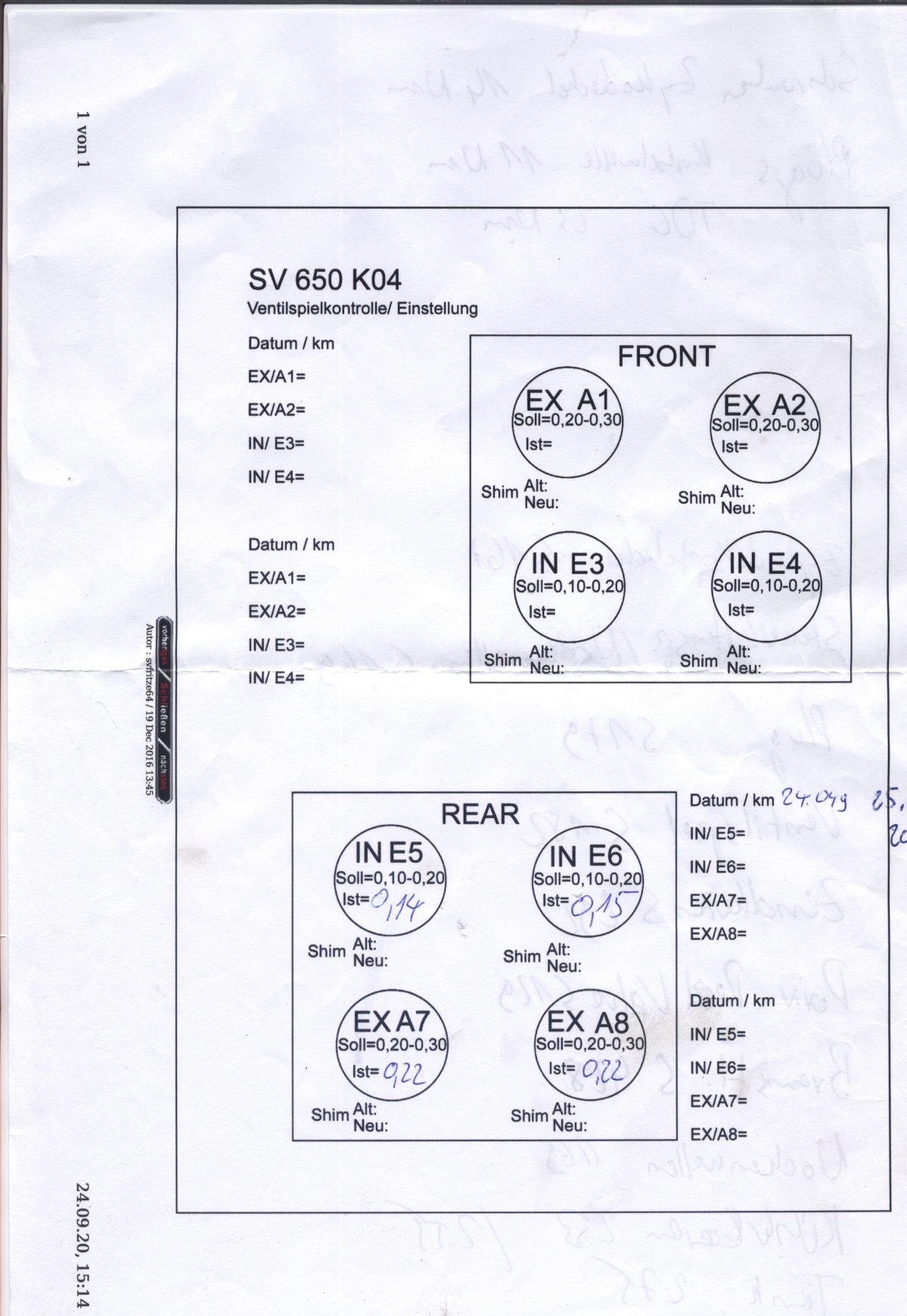 habe nach 47.000 km das Ventilspiel an der neuen SV korrigiert und gedacht, ich schreibe mal ein paar Sätze dazu. Die Maschine wird ziemlich sportlich bewegt. Bei der letzten Kontrolle, nach 24.000km, hatte ich nur den hinteren Zylinder kontrolliert. Die Auslassventile haben sich seitdem um 4/100 mm gesetzt und waren jetzt über der Verschleißgrenze. Erstaunlich: die Einlaßventile haben sich auf Grund der geringeren thermischen Belastung nur um 1/100 mm (wenn überhaupt verändert). (Siehe Bilder)