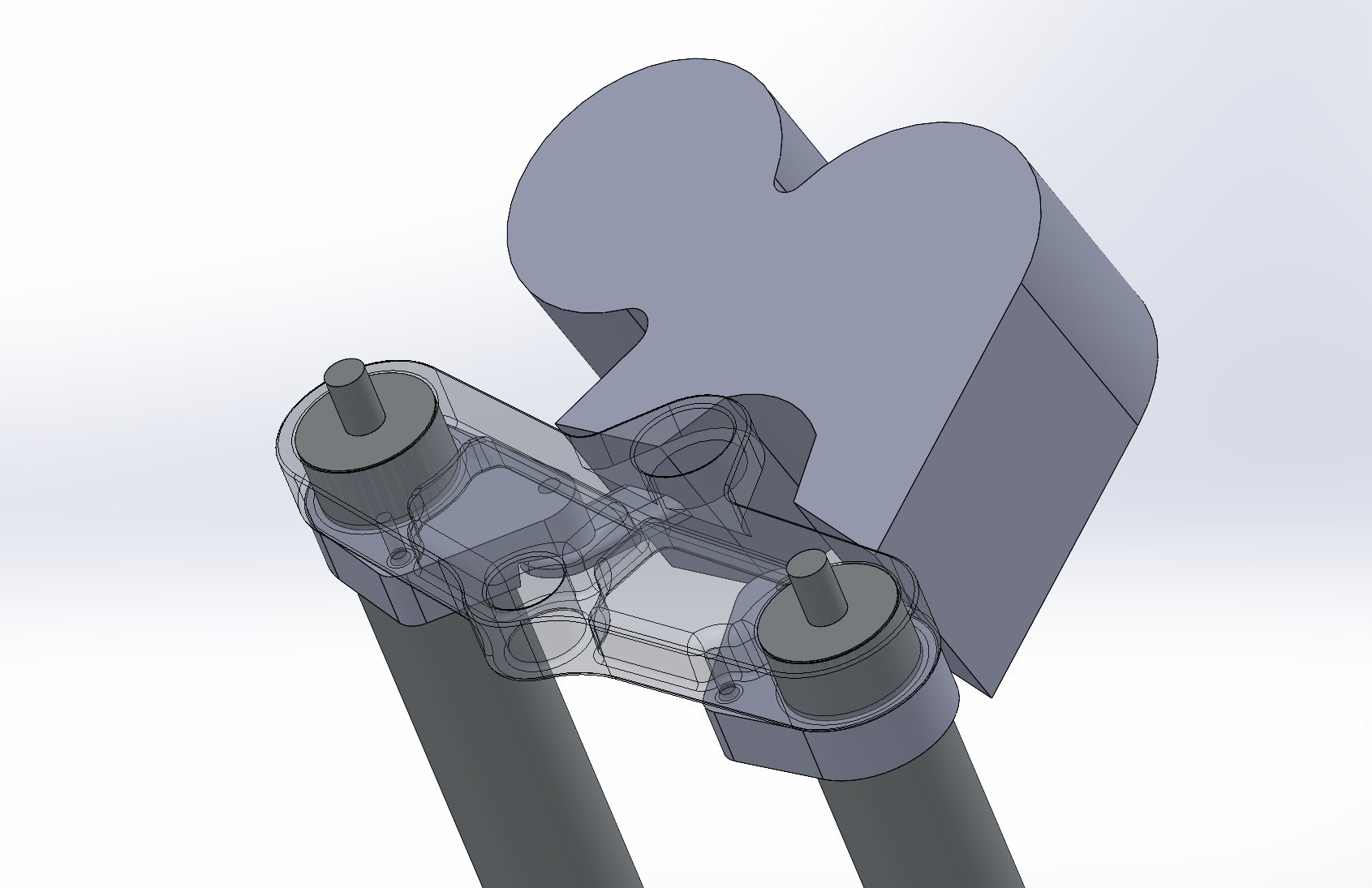 Eine deutlich bessere Linie von Soziussitz über Tank und Lenker. Natürlich sind Design und Umsetzung zwei sehr unterschiedliche Dinge. Ich hab dann angefangen und in Solidworks erstmal die Gabelbrücke/Lenker usw. nachkonstruiert, um von der Basis aus die neuen Teile zu fertigen. Wichtig ist hier, dass die Tachohalterungen der SV Gabelbrücke in der SRAD nicht mehr existieren. Dafür wird die Stummel-Arretierung "missbraucht".