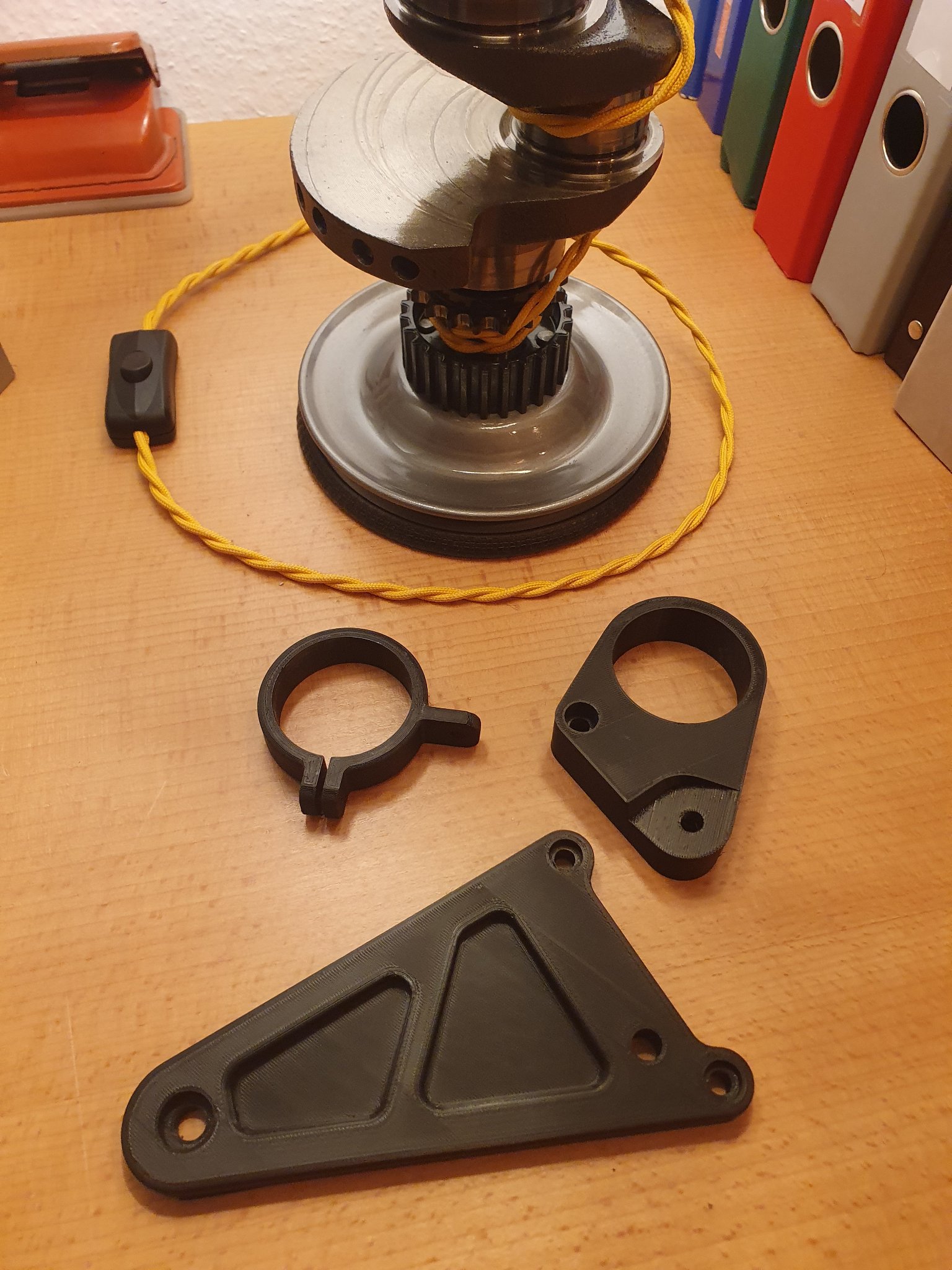 So, habe die 3D Teile erhalten, sieht recht vielversprechend aus. Montieren kann ich leider erst, wenn ich Schrauben dafür habe und die Gabel is ja auch noch nicht da, da muss ich mir eine Rohralternative suchen. Der Winkel der Tachohalterung scheint im ersten Augenblick etwas zu steil, aber das kann täuschen, auch kann er insgesamt noch ein Stück weiter nach hinten, das Lenkschloss bietet recht viel Platz.