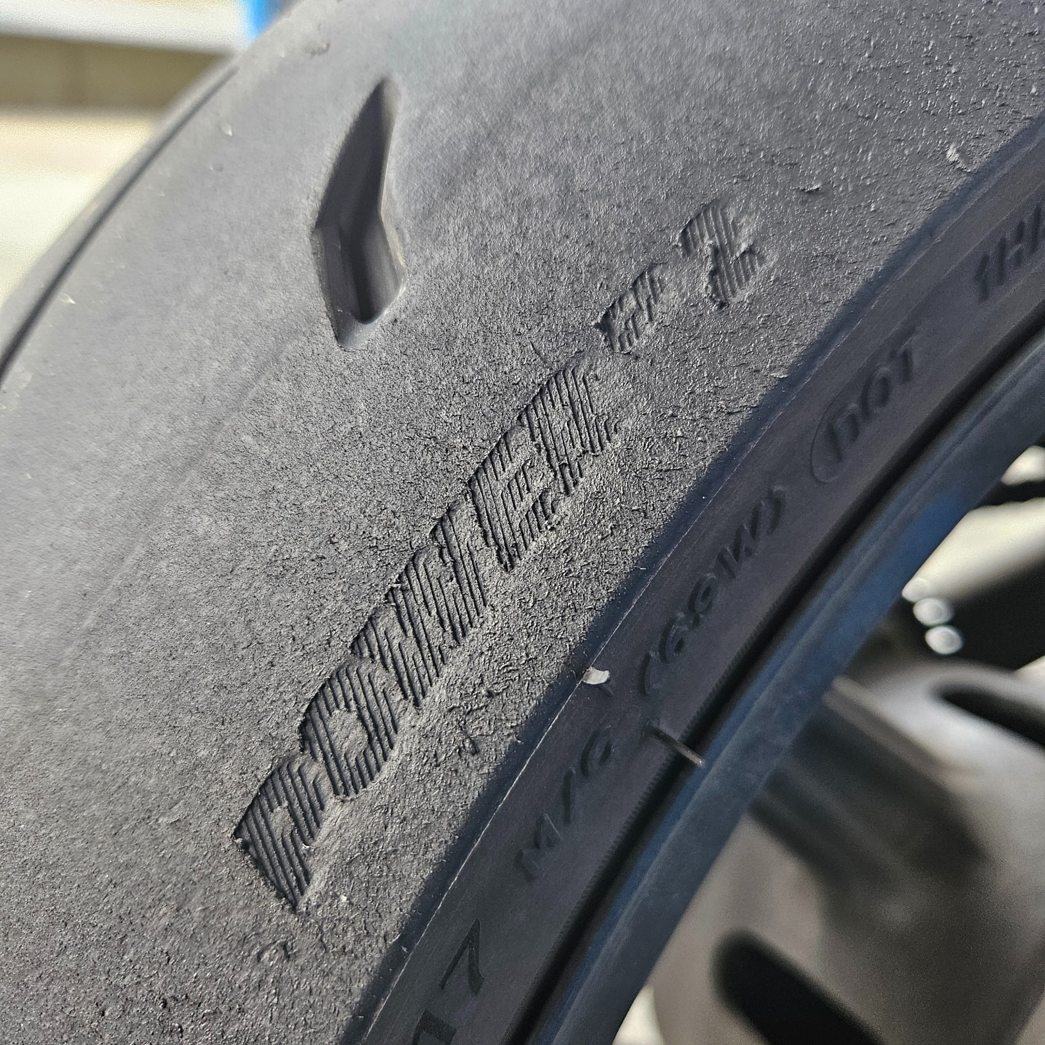 Was erstmal auffällt, sind die doch etwas ungewöhnliche Form des Vorderreifens und seine hohe Anfangsprofiltiefe von 5mm in der Mitte und 4mm am Rand. Der eine Bekannte hat die Form als "ballig" beschrieben, ein besseres Wort fällt mir auch nicht ein. Irgendwie erinnert er mich mehr an den V02, den ich für die Rennstrecke habe, als an die anderen Straßenreifen, die ich so kenne. Ich hatte erst befürchtet, sie hätten es mit der steilen Flanke übertrieben, so dass man den Reifen nicht ganz nutzen könne. Aber es waren dann nach der Tour noch so 3 bis 4mm am Rand unbenutzt, so dass das wohl ganz gut passt.