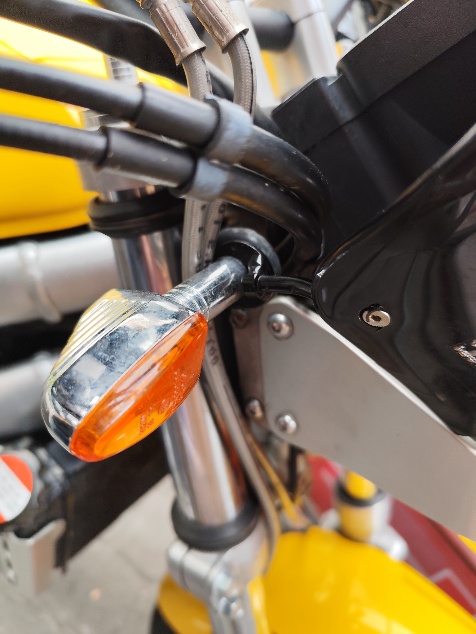 Der Lenker ist auch nicht besonders hoch, die Bremspumpe ist etwas näher zur Lenkermitte gelandet, trotzdem spannt sich die Stahlflex vorne über die untere Gabelbrücke, egal ob die Leitung vor oder hinter dem Blinker verläuft.