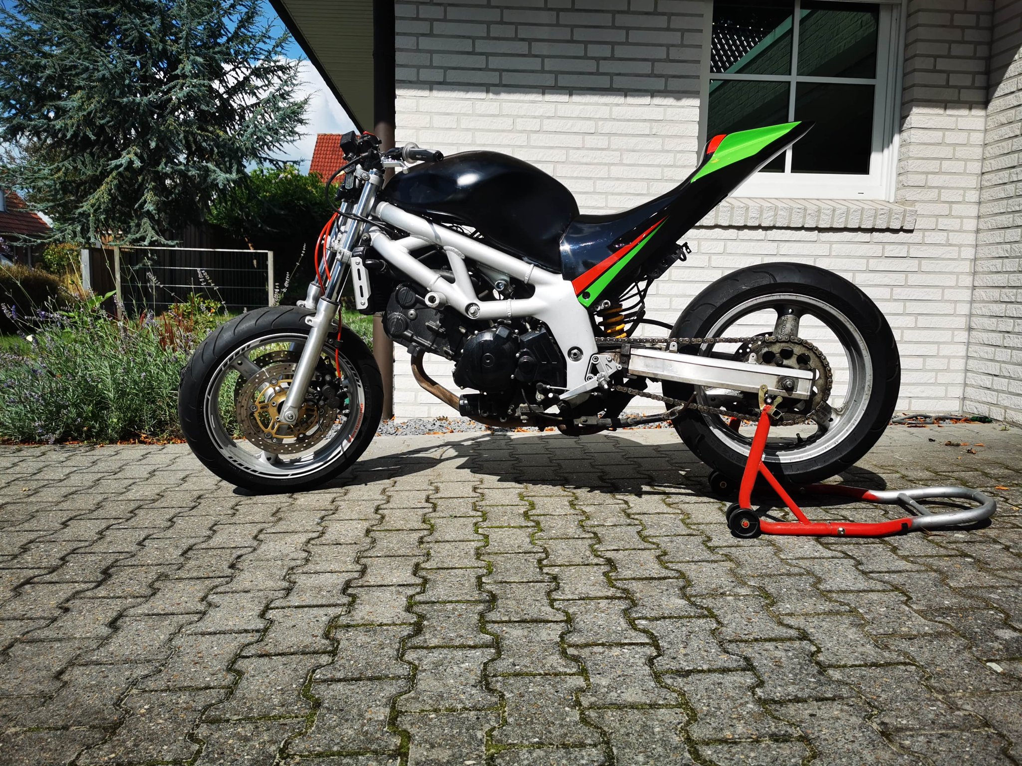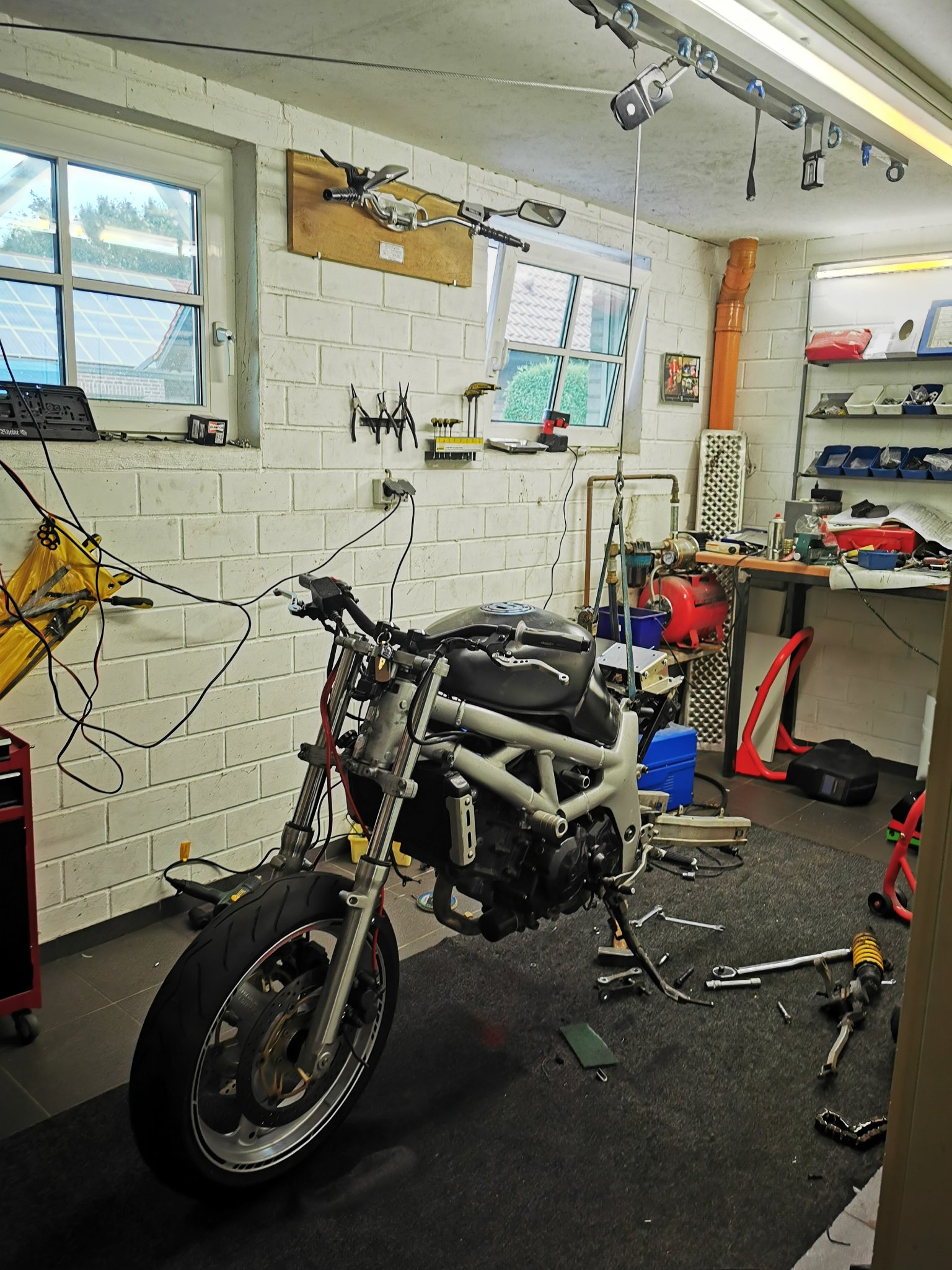 Also erst einmal mit einem Bier in die Garage gehockt und überlegt, was soll aus ihr werden soll. Eigentlich war der Plan, sie auf der Straße zu fahren. Ich war von der Wendigkeit der SV von einer Freundin extrem begeistert.