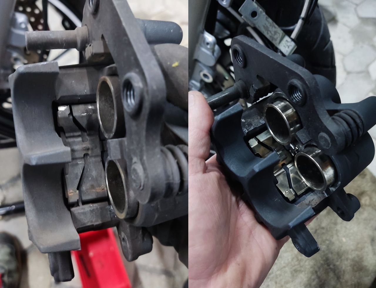 Alle Bremszangen einmal reinigen und anschließend die Bremsflüssigkeit wechseln. Die verbauten Bremsbeläge sind vorne wie hinten neuwertig.