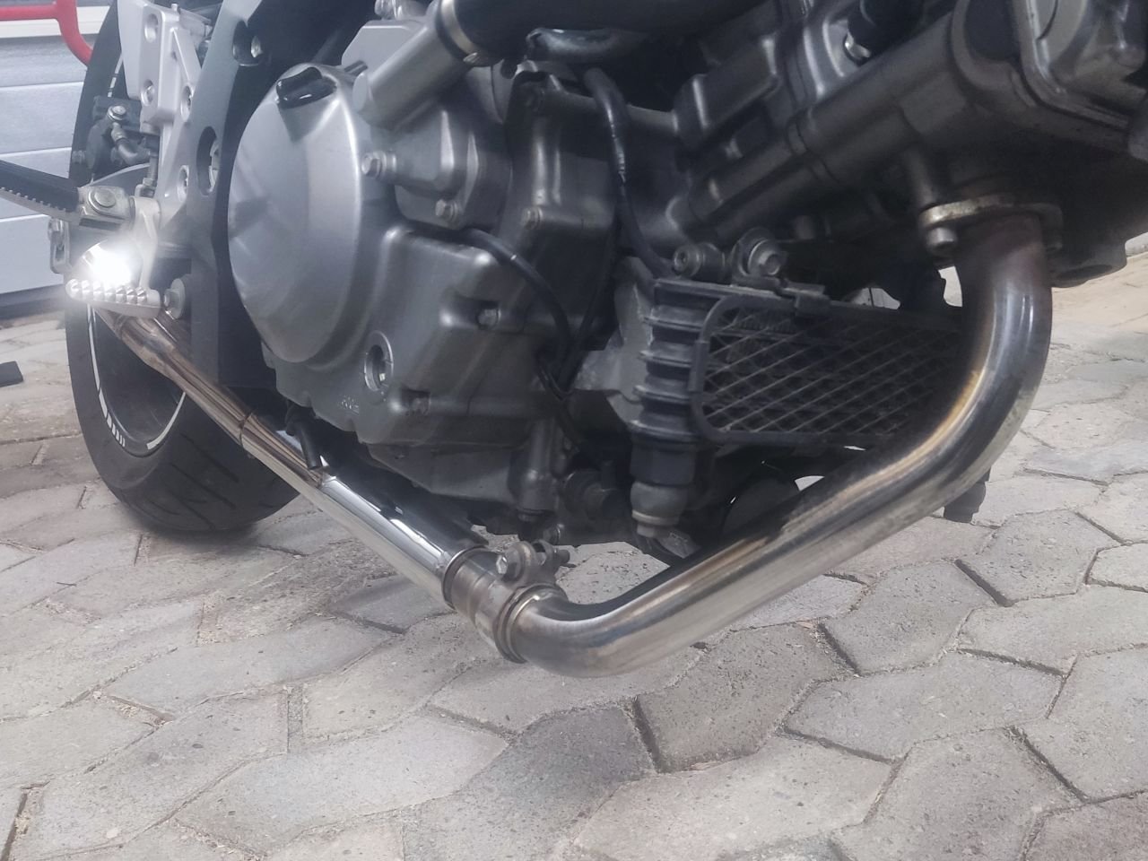 Meine nächste Handlung galt dem Krümmer. Ein Phänomen, das ich seit Jahren beobachte, auch auf dem SV-Treffen, ist wie schrecklich viele Krümmer an den SVs aussehen. Dass sie sich verfärben ist völlig normal. Auch, dass es Unterschiede gibt jenachdem wo und wie die SV eingesetzt und gefahren wird. Was ich aber nicht verstehe, dass so wenige ihre SV Krümmer säubern. Dabei ist das mit wenig Aufwand einfach möglich und das Ergebnis ist, meiner Meinung, wirklich phänomenal.