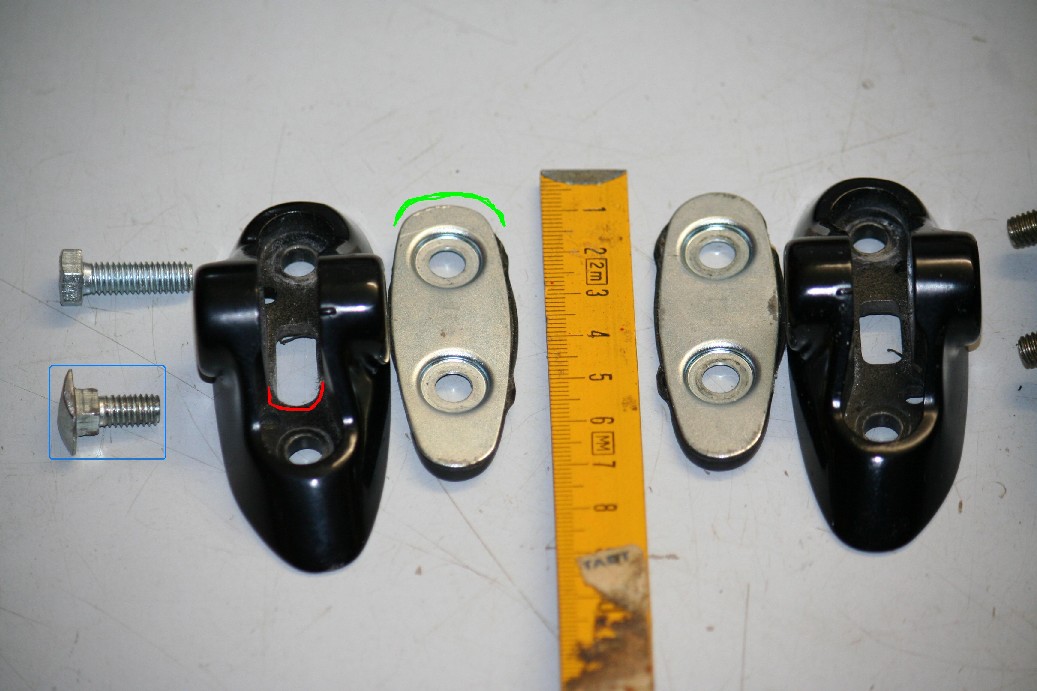 * Blaue Markierung: Ich habe eine Schraube mit flachem Kopf benutzt, weil ich kein geeignetes Werkzeug zum Abschleifen habe. Den Kopf habe ich an zwei Seiten abgesägt, damit er passt, außerdem habe ich ihn noch etwas flacher gefeilt, damit der Spiegel-Arm besser passt. Details seht ihr im zweiten Bild.
