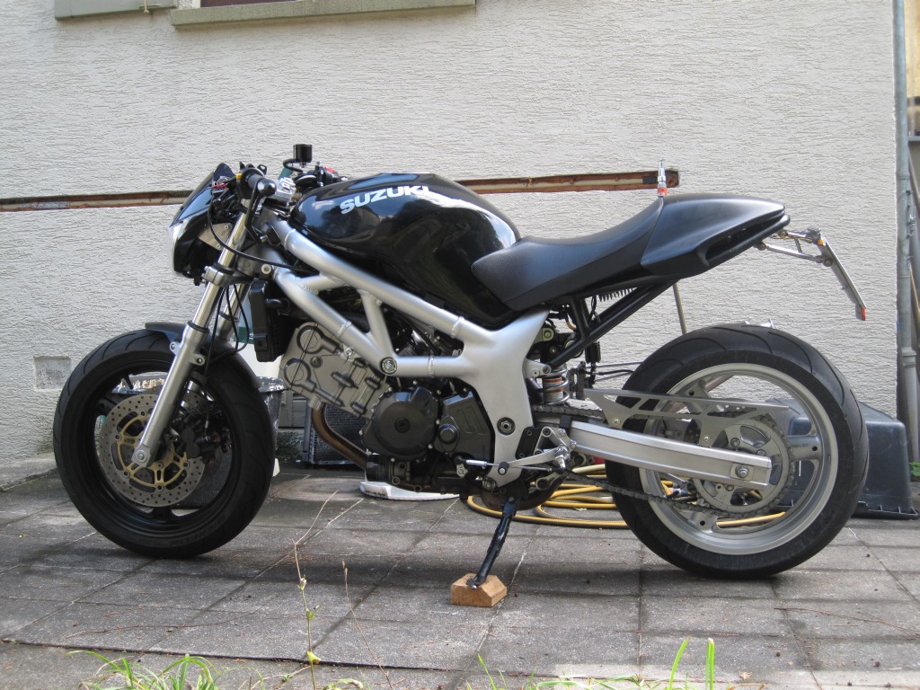 Damit ist allerdings nicht meine Kleine mit Einarmschwinge gemeint, sondern die schwarze SV650, die ich seiner Zeit für meine Exfreundin gebaut hatte und dann leider doch auf taube Ohren gestoßen ist (wer zur Hölle bevorzugt eine CBF 600?!).
