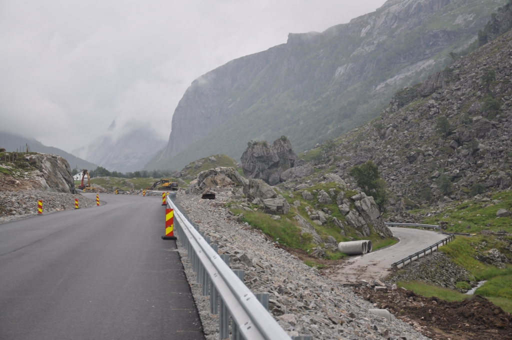 Nach dem Geiranger trennen sich unsere Wege. Joe fährt noch etwas Richtung Oslo, ich nehme die westliche Route. Hier möchte ich eine als Geheimtipp angepriesene Strecke fahren. Leider wird die Strasse gerade begradigt. Pfff. In Norwegen ist das natürlich etwas anderes, da haben solche Strassen einen echten Bedarf und werden tagtäglich von den Anwohnern befahren. In der Schweiz dagegen kommt man auch mit geschlossenem Susten noch ins Bernische. Aber nur zugerne hätte ich die enge, kurvige Strasse (rechts unten im Bild) befahren.