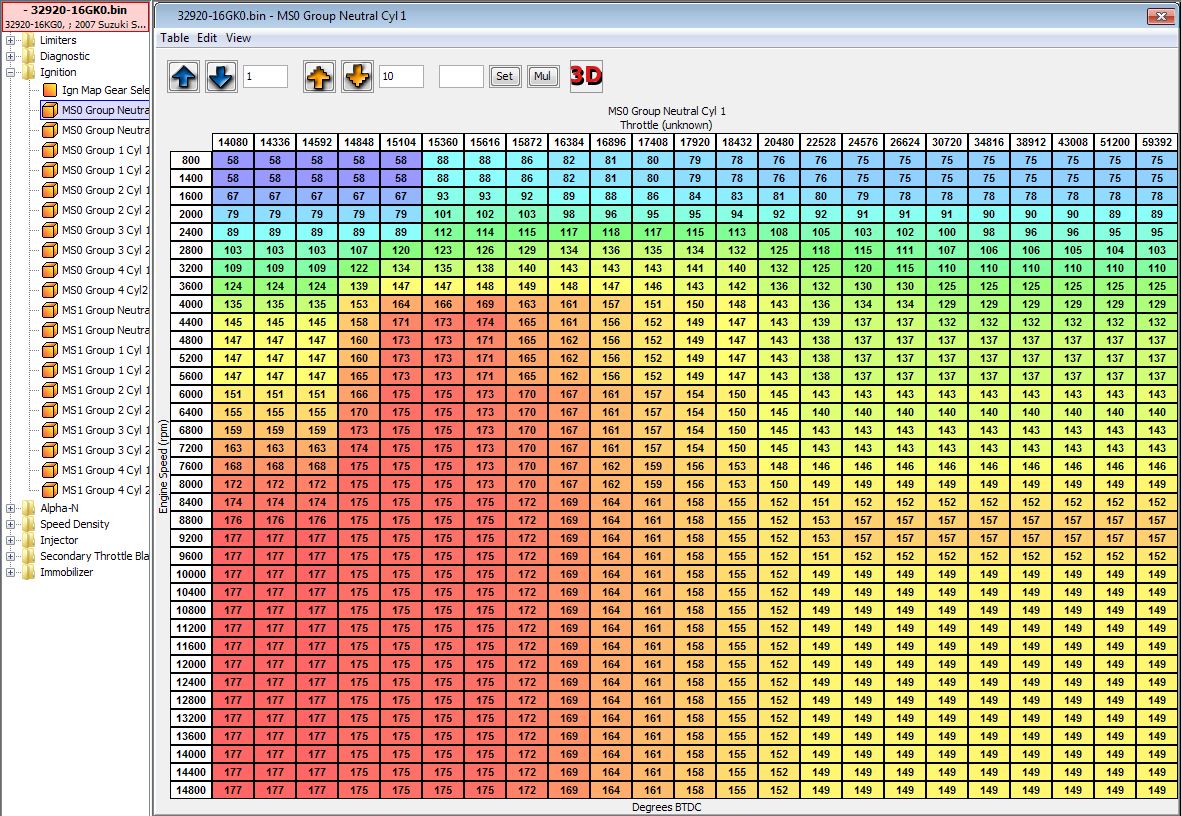 Das sieht ja schon mal super interessant aus....rein von der ersten Betrachtung Map für Zylinder 1, bezogen auf Drehzahl und Drosselklappenstellung, Mapswitch 0 ( also ungedrosselt, Kabel abgeklemmt...) und Leerlaufposition.