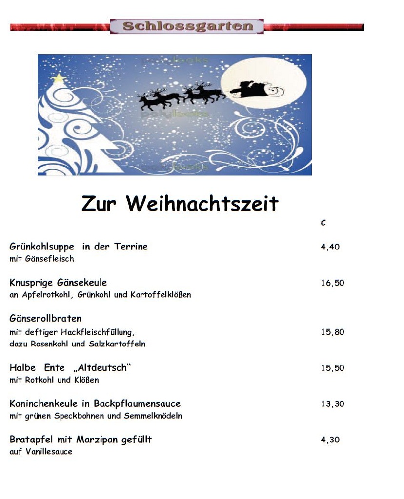 Hiermit könnt ihr Euch verbindlich anmelden, führt dazu einfach die von mir begonnene Liste weiter. Um Engpässe zu vermeiden und der Küche ein entspannteres Arbeiten zu ermöglichen, bietet es sich an sein Menü schon vorab zu wählen. Teile der Speisekarte und die Weihnachtskarte stelle ich hier mit ein, einen weiteren Auszug findet sich auch auf der Website. Die Öffnungszeiten sind locker zu sehen, da der Wirt mit Sicherheit keine Gäste, die noch verzehren, vor die Tür setzt. Schöni wird auch mit dabei sein, denn sie wird uns bedienen. Extrawünsche beim Essen ("mit extra viel Grünkohl") sind natürlich möglich, aber bitte hier rechtzeitig anmelden. Anmeldeschluss für die Menüvorwahl ist der 30.11.2012 18:00Uhr