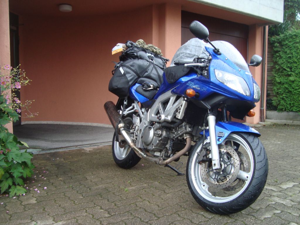 Eine ordentliche Tour startet immer mit einem Bild der vollgeladenen Maschine. :wink: 70'000km hat meine SV vor der Reise auf der Uhr. Ein paar Wochen zuvor hatte ich noch Probleme mit dem berüchtigten grünen Stecker. Zusammen mit meinem Mech (der mir erst nicht glauben wollte, dass der grüne Stecker schuld ist) haben wir das Ganze neu verkabelt und seither schnurrt das Kätzchen wieder ununterbrochen.