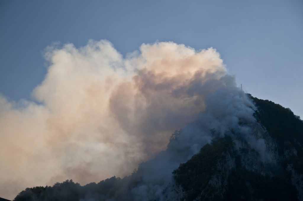 Ein heftiger Waldbrand tobt auf dem Berg. Wir hören sogar das Knacken des lodernden Feuers.