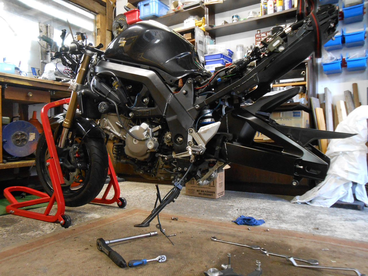 Heute waren wir mal wieder fleißig: um 11:00 Uhr begann der Arbeitstag erstmal mit ein wenig sortieren. Elektrik wurde zuende verlegt, der besagte Widerstand endlich festgeschraubt. Anschließend ging es dann an den Schwingeneinbau, was eigentlich auch problemlos funktionierte. Alles zusammengesteckt und schon waren wir nach ein wenig Schrauberei bei unserer größten Hürde angelangt: Der hintere Krümmer musste wieder ran! Nach stundenlangem verrenken, Gliedmaßen brechen, diverse Sachen aus dem Weg herausbauen und vor allem Fluchen war es dann doch vollbracht. Der restlichen Zusammenbauerei stand also nichts mehr im Wege. Schwinge war drin, Rad und Kette mit Ritzel auch (nach bearbeiten des Schleifschutzes lief die Kette mit einer Unterlegscheibe unter dem Ritzel auch einwandfrei), Federbein war auch dran, Krümmeranlage wurde rangebaut, Umlenkung irgendwie auch noch wieder ein wenig geputzt und gefettet, hintere Bremsanlage rangeschraubt, befüllt und entlüftet, Endtopf montiert, Heckverkleidung drangeschraubt, neuen Auspuffhalter (zum Glück habe ich eine flexible Schelle und nicht die originale Anlage ;) ) ausprobiert und schlussendlich die Kanzel mit dem ganzen Gedöns, der Kennzeichenhalter, Sitz und Seitendreicke montiert. Alles war dann so gegen 19:00 Uhr auch geschafft, genauso wie wir!