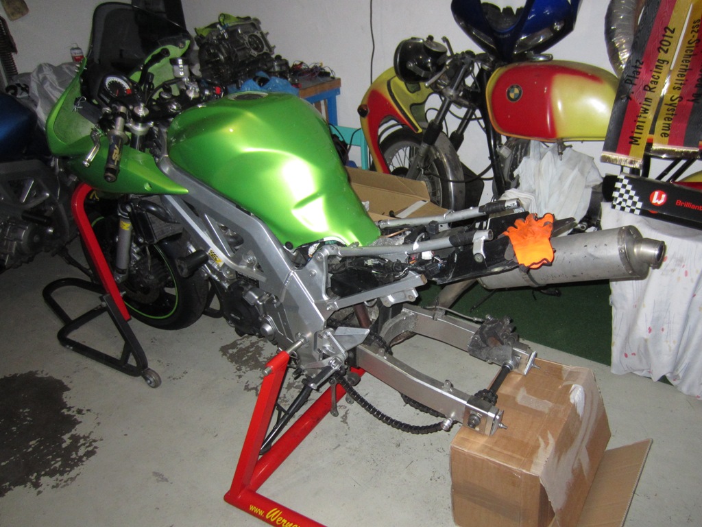 Das Wilbers Federbein sollte Einzug erhalten. Also erst mal die Heckverkleidung ab, das Hinterrad raus und das GSX-R Federbein demontiert, welches 2012 super Dienste verrichtete.