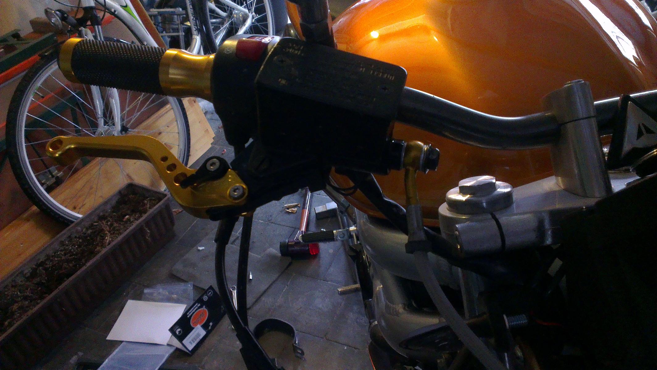 Heute hab ich vorn schonmal die Stahlflexleitung installiert. Die Hebel sind Chinahebel und die Griffe sind originale Rizoma...