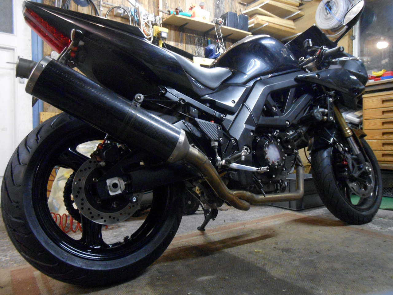 Seit dem letzten Mal hat sich wieder ein wenig was getan. Nähern uns mit immer kleiner werdenden Schritten dem Ende: Fußrastenplatten wurden mit dem Hinkeldeckel seidenmatt schwarz lackiert (es hat mich letztlich doch gestört), Carbonfolie zum Schutz der Lackierung hat den Weg auf die Fersenschoner gefunden, die Kupplungspumpe und der Zylinder wurden nochmals getauscht (die Zahnfee hat mir einen K3 Zylinder unters Kopfkissen gelegt, der nur noch auf eine Wartung wartete, jetzt geht das Ding sowas von für Mädchen), es hat ein neues Halteblech für die Heizgriffsteuerung den Weg an den Lenker gefunden (erwähnte ich schonmal, dass ich sägen und feilen hasse?), Kette wurde einmal erfolglos vernietet (Testlauf führte leider noch nicht zum gewünschten Ergebnis, jetzt muss nochmal ernst gemacht werden :mrgreen: ).