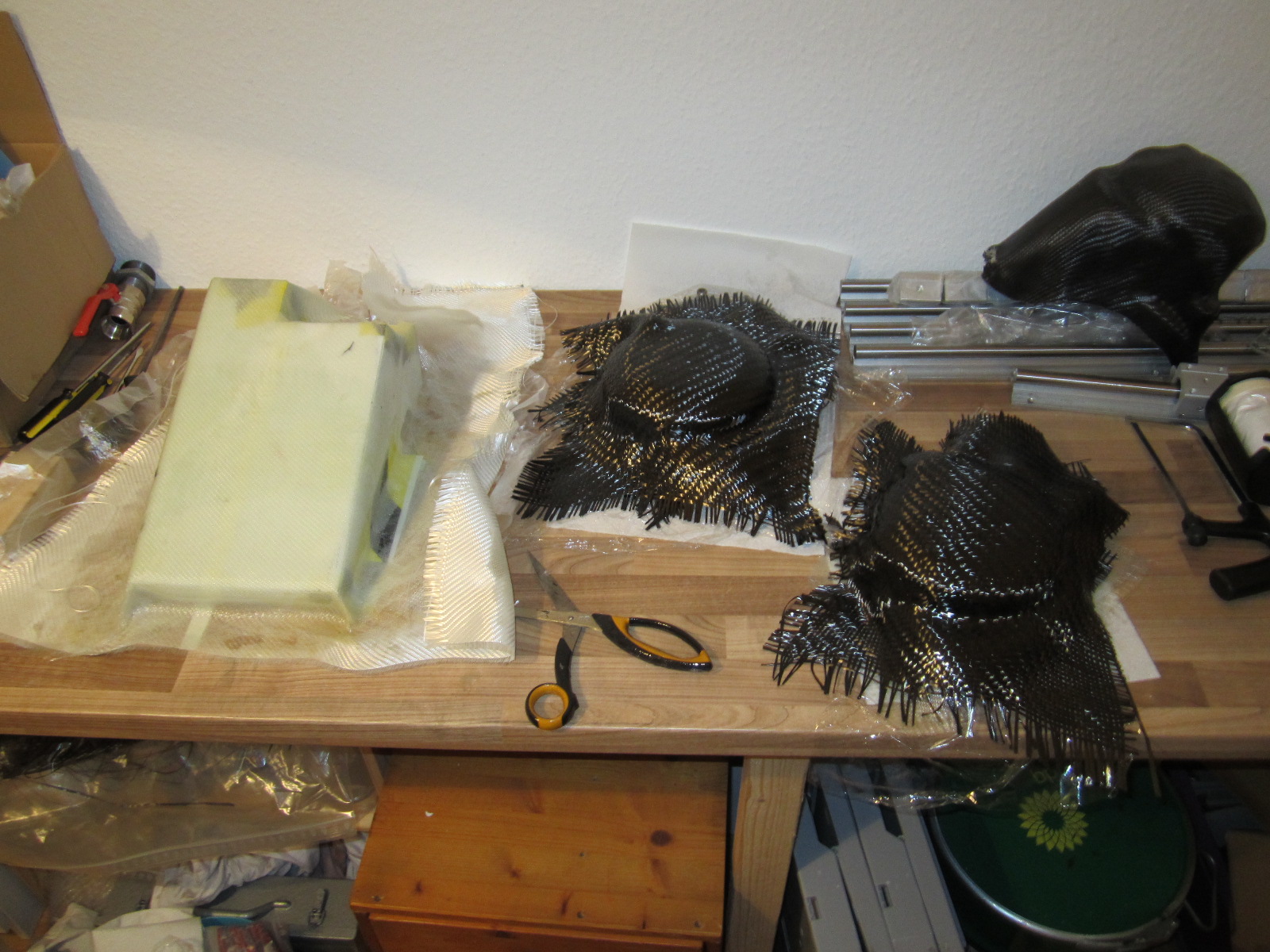 Das Teil links daneben sollte mein Batteriekasten werden, ist aber vermutlich in die Hose gegangen, da zu kantig. Da muss nun eine schnelle, leichte Ersatzlösung her, bzw schaue ich mal ob ich das Ding irgendwie retten kann.
