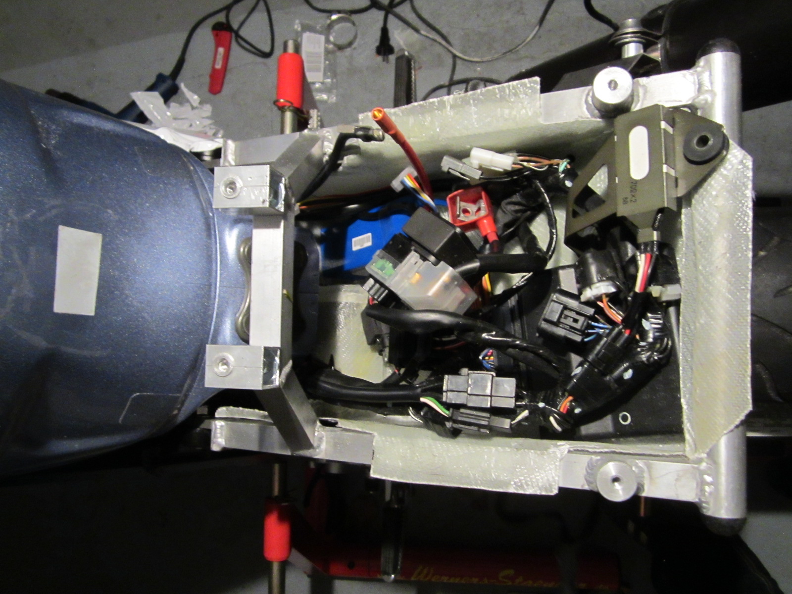 Ich habe den Kasten so gut es ging durch das Besäumen gerettet. Ehrlich gesagt auch aus dem Grund, weil ich keine Lust hatte mich mit einem so unwichtigem Teil länger als nur irgendnötig aufzuhalten. Der Kasten sollte eigentlich recht locker im Heckrahmen hängen und an drei Streben mit zwischengelegtem Moosgummi aufliegen. Durch die Umstände ist es jetzt eine Presspassung geworden und Moosgummi wird nicht an allen Berührpunkten zum Einsatz kommen können. Daher werden die einzelnen elektrischen Aggregate (wie sagt man dann zu Relais, Steuergeräte und Co?) durch Moosgummi bestmöglich von Motorvibrationen entkoppellt und mit etwas dickerem isolierten Kupferdraht an Ort und Stelle verdrillt, bzw. mit doppelseitig klebendem Klettband fixiert.