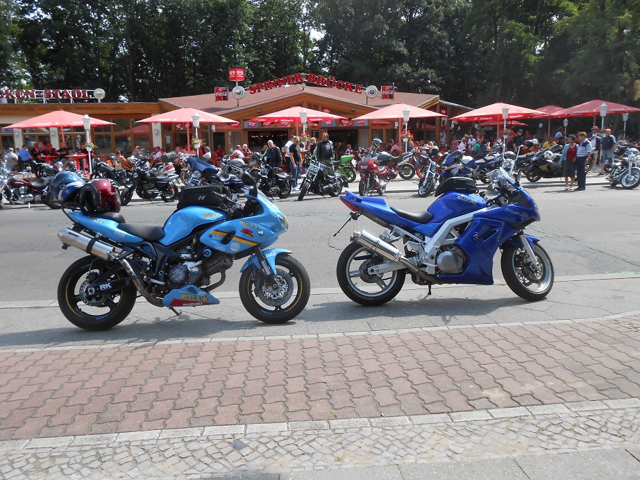 Zwei mir unbekannte Suzuki Motorräder, angetroffen in Berlin an der Spinner Brücke, gehören wohl zwei Spinnern :-)