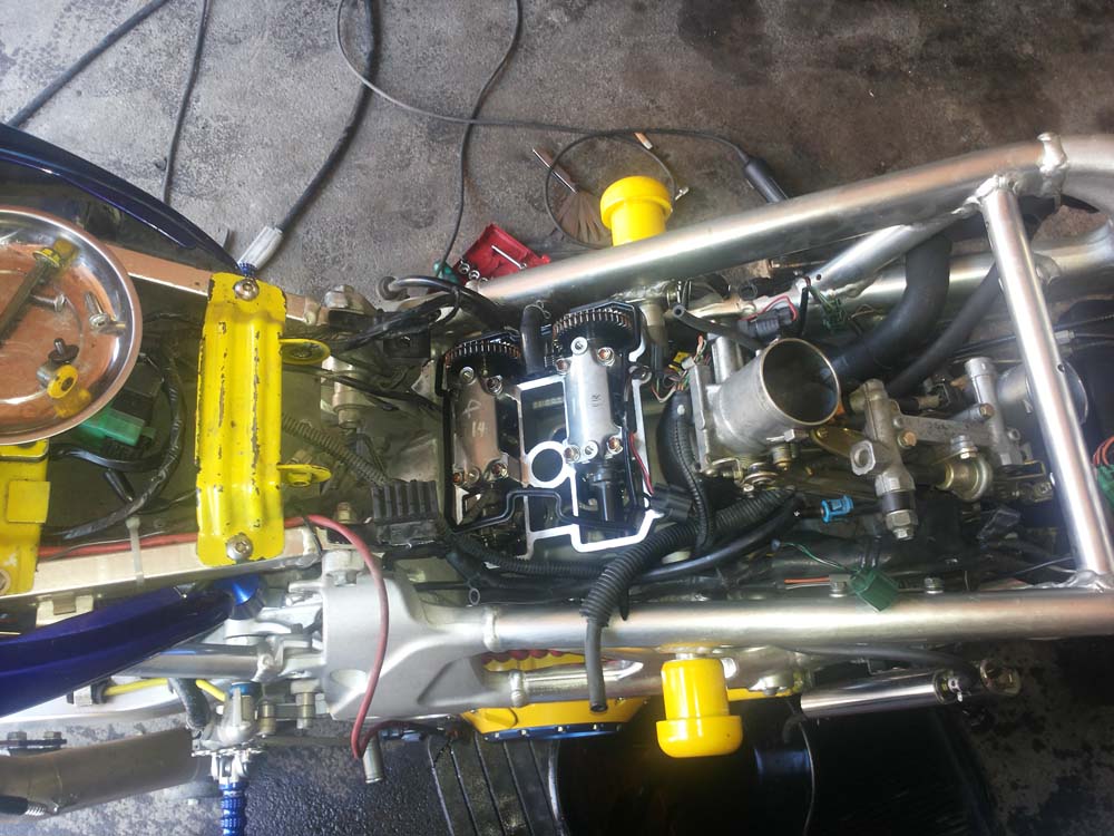 als dann der Zylinderkopf drauf ging kam der R motor rein und in dem zuge gleich ein Lotharkrümmer dran, größere Airbox, Rahmendreieck ausgeräumt und und und