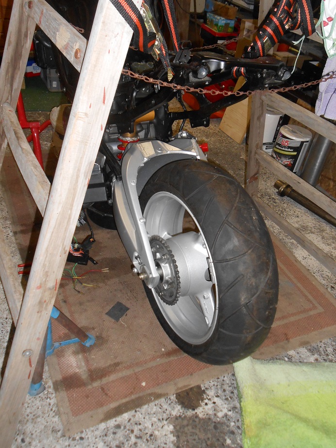 Und als krönenden Abschluss habe ich schließlich die SV100o Felge so grob eingepasst. Das sieht alles ganz gut aus. Das Hinterrad ist aber noch nicht genau "vermittelt" -- nur so ungefähr. Ich habe da auch zunächst die Bremsankerplatte der GSR600 raufgesteckt. Das wird aber so nicht passen (aVa hat's ja auch schon beschrieben): entweder muss eine andere (240mm) Bremsscheibe her oder ich passe einen Bremsanker der Kante an -- das weiss ich noch nicht so genau. Ich werde die Bremsankerplatte der K6 mal auf 25mm aufbohren lassen und dann schau ich mal, ob das mit der K6 Bremse geht -- Versuch macht klug.