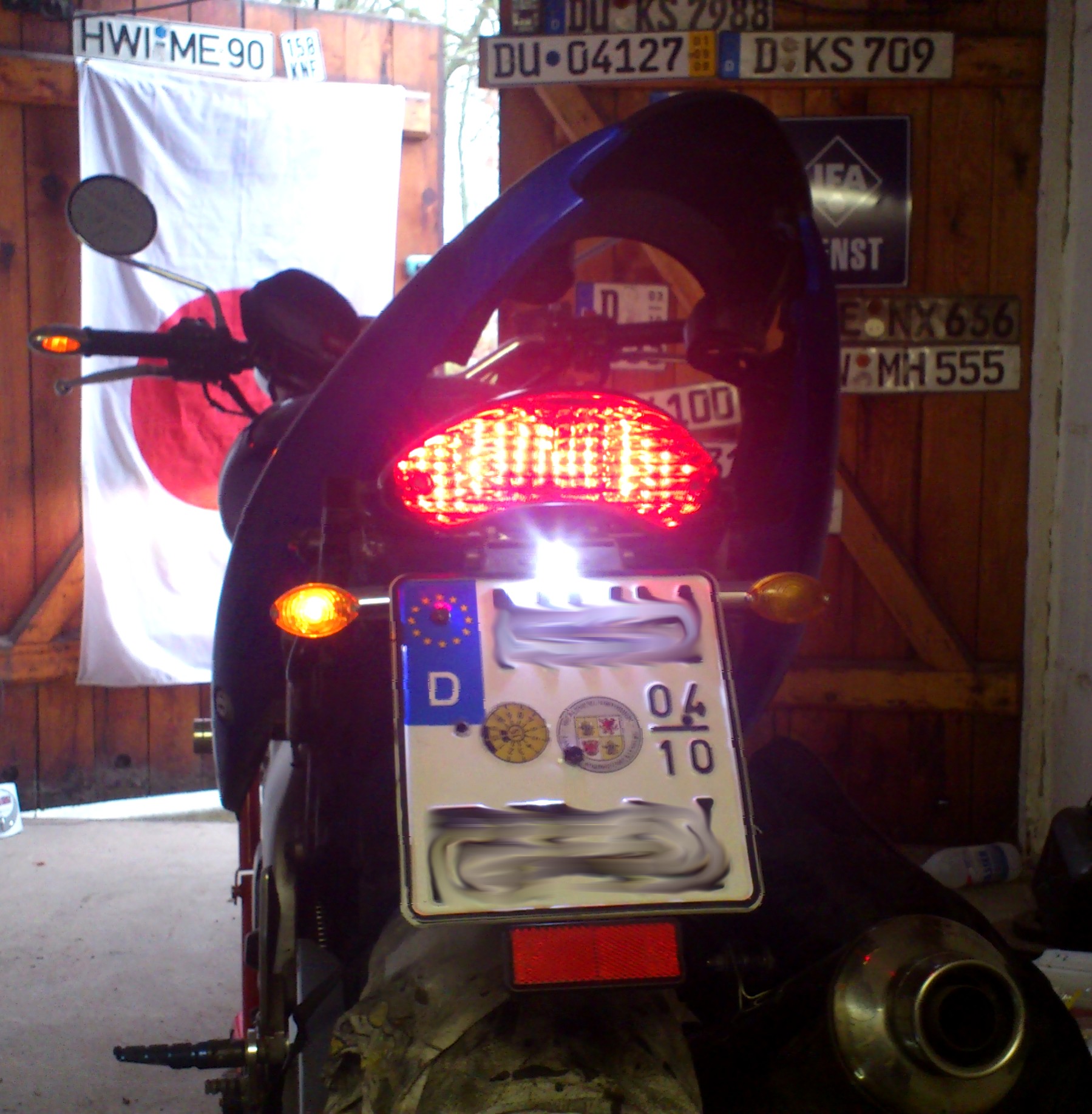 Heute dann den vorbereiteten Kennzeichenträger montiert. Blinker dran. Elektrik wieder angeklemmt. Zündbox im "Handschuhfach" befestigt und abschliessend einmal Funktionskontrolle.