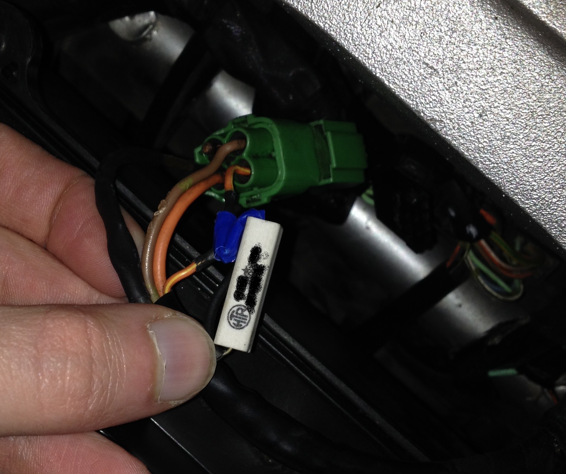 Das von der ECU kommende dünne orange-roten Kabel wird an den Widerstand angelötet und das andere Ende des Widerstands ans dicke orange Kabel.