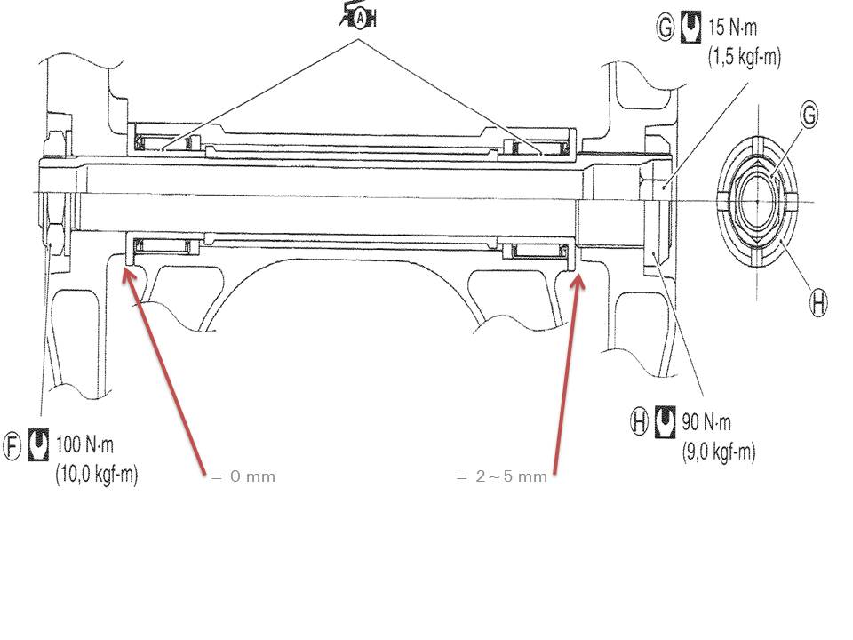Nun sind die Lager unter korrekter Spannung und der Rahmen hat nun keine Vorspannung mehr, das Spiel an der Schwinge muss, mit ca. 0,10 mm, immer noch spürbar sein.