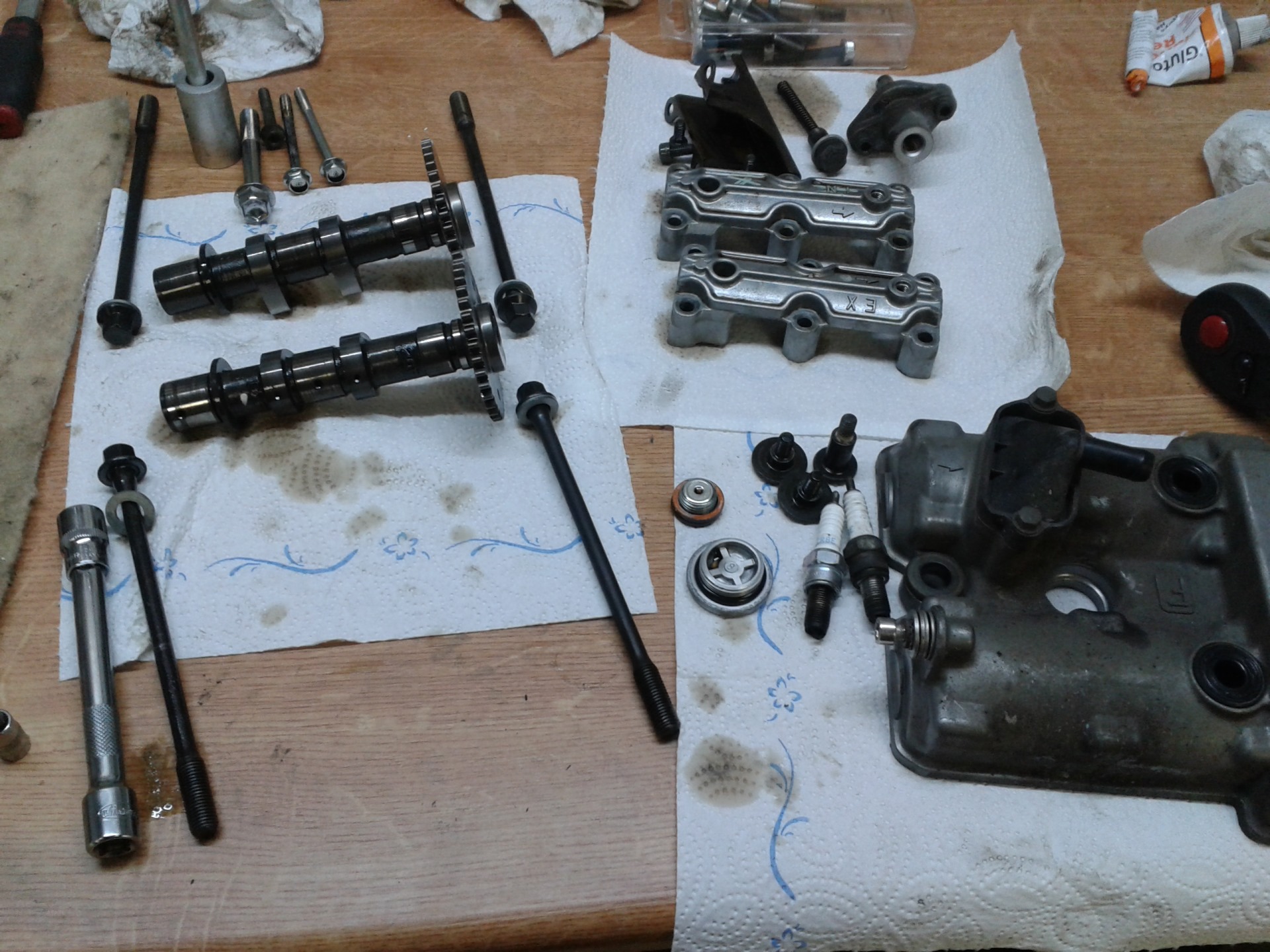 Heute hab ich den Zylinderkopf vorne abgebaut, damit ich die Schraubenstummel aus dem Krümmerflansch entfernen kann. Und die Maße für die Schwingenachsbuchsen hab ich noch aufgenommen.