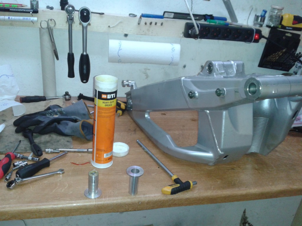 Nachdem die Buchsen gestern endlich fertig geworden sind, habe ich heute die Schwinge mit selbigen ausgestattet und eingebaut.