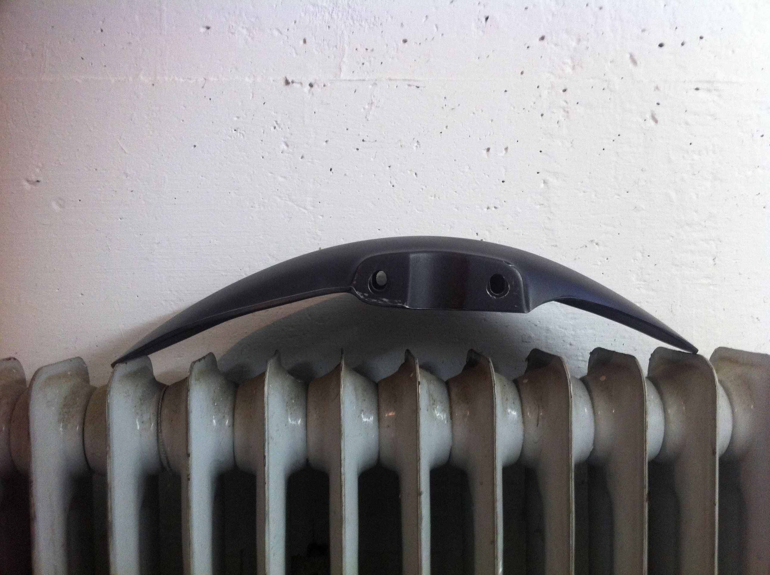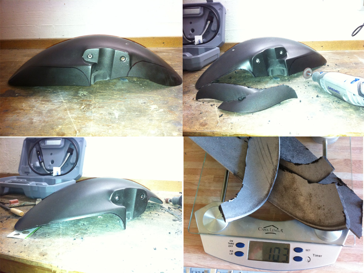 Die Bohrlöcher sind, soweit es das Konterblech auf der Rückseite zulässt, gelängt, damit er niedriger über dem Reifen hängt. Insgesamt hat er irgendwas zwischen 200 und 250 Gramm verloren und liegt natürlich im Moment beim...TADAAAA! Lackierer.