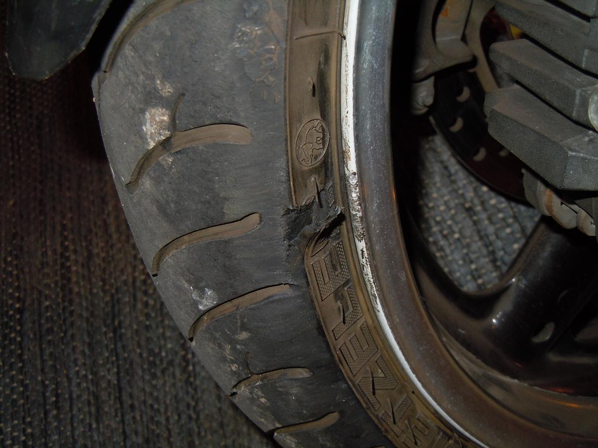 Nur vorne ist an der Reifenflanke ein Stück eingerissen. Ist jedoch dicht und läuft beim Fahren auch noch rund.