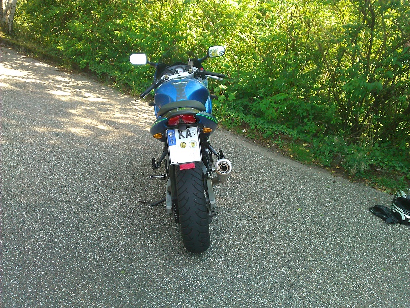 Plakette bekommen :) :D Hab mir erst schon in die Hosen gemacht als ich den strengen Prüfer von letztem mal in der Halle rumspringen sah. Kam aber zum Glück ein anderer. Am Heck wurde nichts bemängelt...hatte ja die Streben am Rahmen abgesägt :P Wegen dem GSXR Rücklicht hatte er auch nichts gesagt.